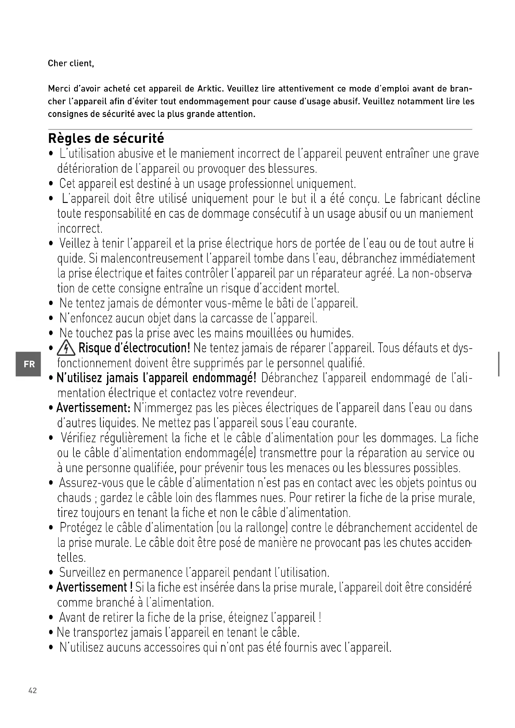 Cher client, Merci d’avoir acheté cet appareil de Arktic. Veuillez lire attentivement ce mode d’emploi avant de bran- cher l’appareil afin d’éviter tout endommagement pour cause d’usage abusif. Veuillez notamment lire les consignes de sécurité avec la plus grande attention. Règles de sécurité