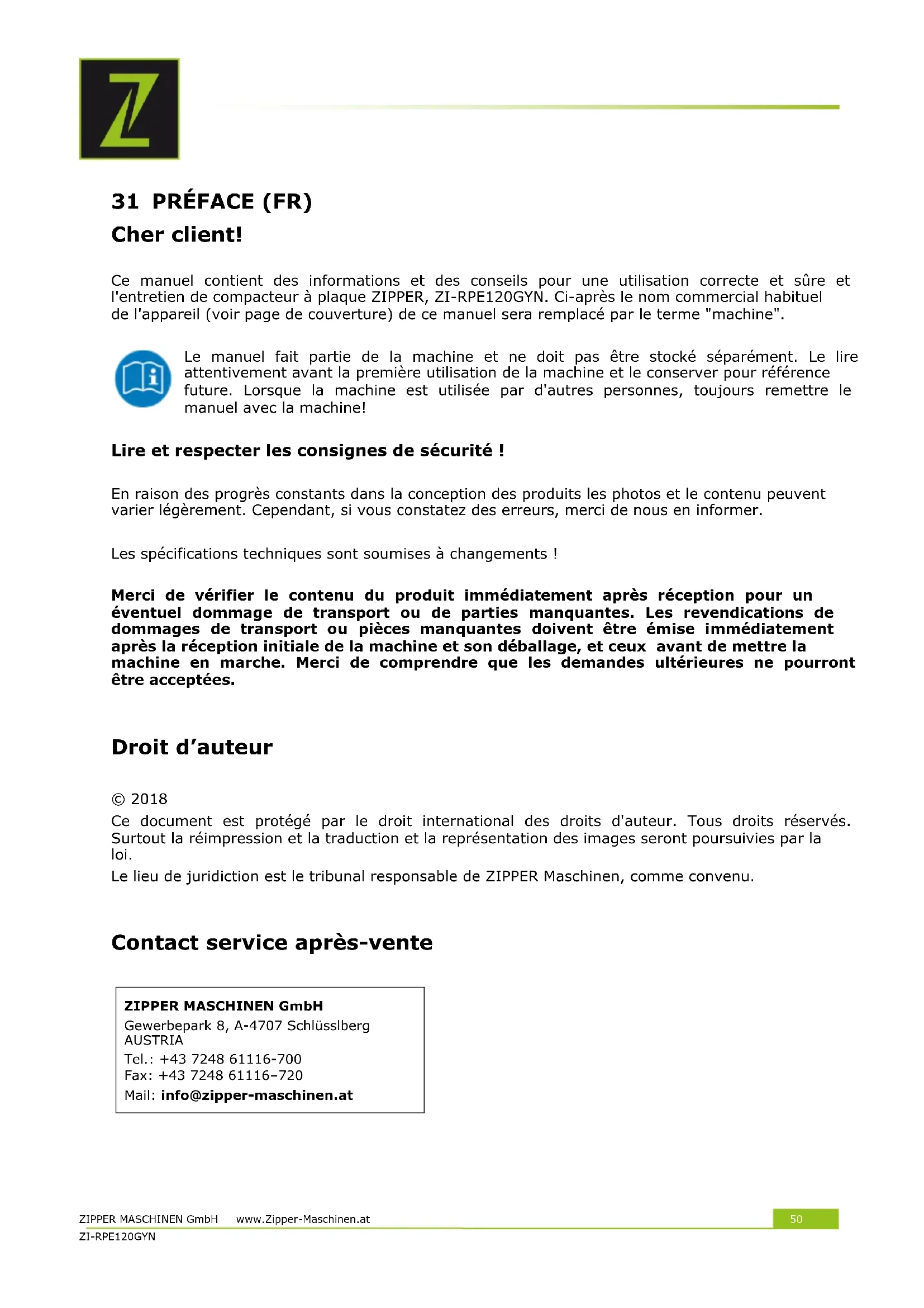 Droit d’auteur © 2018 Ce document est protégé par le droit international des droits d'auteur. Tous droits réservés. Surtout la réimpression et la traduction et la représentation des images seront poursuivies par la loi. Le lieu de juridiction est le tribunal responsable de ZIPPER Maschinen, comme convenu.