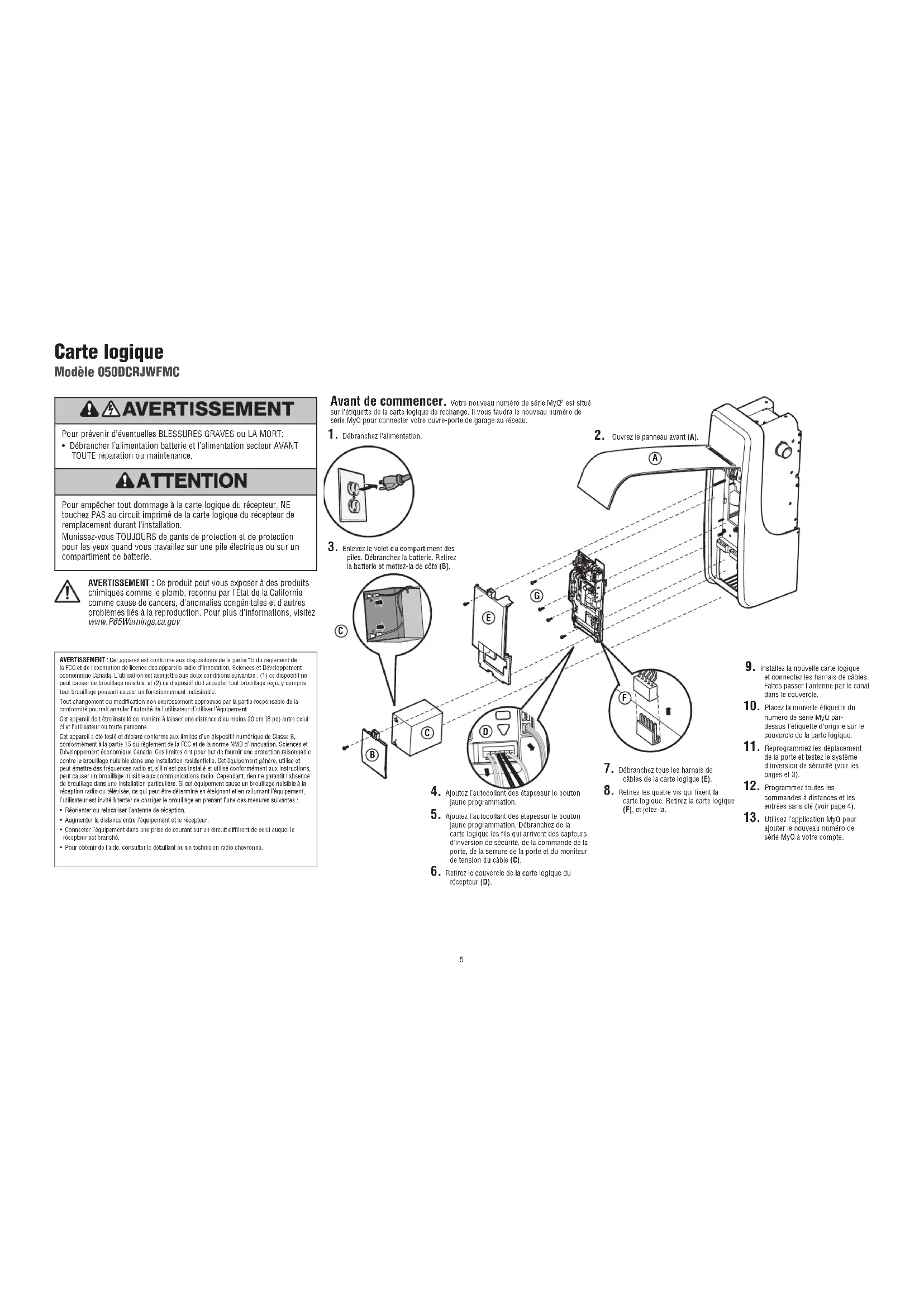 Visor Clip LEARN LED LEARNButton5 Carte logique Modèle 050DCRJWFMC Pour prévenir d’éventuelles BLESSURES GRAVES ou LA MORT:• Débrancher l’alimentation batterie et l’alimentation secteur AVANT TOUTE réparation ou maintenance.Pour empêcher tout dommage à la carte logique du récepteur, NE touchez PAS au circuit imprimé de la carte logique du récepteur de remplacement durant l’installation.Munissez-vous TOUJOURS de gants de protection et de protection pour les yeux quand vous travaillez sur une pile électrique ou sur un compartiment de batterie.AVERTISSEMENT : Ce produit peut vous exposer à des produits chimiques comme le plomb, reconnu par l’État de la Californie comme cause de cancers, d’anomalies congénitales et d’autres problèmes liés à la reproduction. Pour plus d’informations, visitez www.P65Warnings.ca.govAVERTISSEMENT : Cet appareil est conforme aux dispositions de la partie 15 du règlement de la FCC et de l’exemption de licence des appareils radio d’Innovation, Sciences et Développement économique Canada. L’utilisation est assujettie aux deux conditions suivantes : (1) ce dispositif ne peut causer de brouillage nuisible, et (2) ce dispositif doit accepter tout brouillage reçu, y compris tout brouillage pouvant causer un fonctionnement indésirable. Tout changement ou modification non expressément approuvés par la partie responsable de la conformité pourrait annuler l’autorité de l’utilisateur d’utiliser l’équipement.Cet appareil doit être installé de manière à laisser une distance d’au moins 20 cm (8 po) entre celui-ci et l’utilisateur ou toute personne.Cet appareil a été testé et déclaré conforme aux limites d’un dispositif numérique de Classe B, conformément à la partie 15 du règlement de la FCC et de la norme NMB d’Innovation, Sciences et Développement économique Canada. Ces limites ont pour but de fournir une protection raisonnable contre le brouillage nuisible dans une installation résidentielle. Cet équipement génère, utilise et peut émettre des fréquences radio et, s’il n’est pas installé et utilisé conformément aux instructions, peut causer un brouillage nuisible aux communications radio. Cependant, rien ne garantit l’absence de brouillage dans une installation particulière. Si cet équipement cause un brouillage nuisible à la réception radio ou télévisée, ce qui peut être déterminé en éteignant et en rallumant l’équipement, l’utilisateur est invité à tenter de corriger le brouillage en prenant l’une des mesures suivantes :• Réorienter ou relocaliser l’antenne de réception.• Augmenter la distance entre l’équipement et le récepteur.• Connecter l’équipement dans une prise de courant sur un circuit différent de celui auquel le récepteur est branché.• Pour obtenir de l’aide, consulter le détaillant ou un technicien radio chevronné.