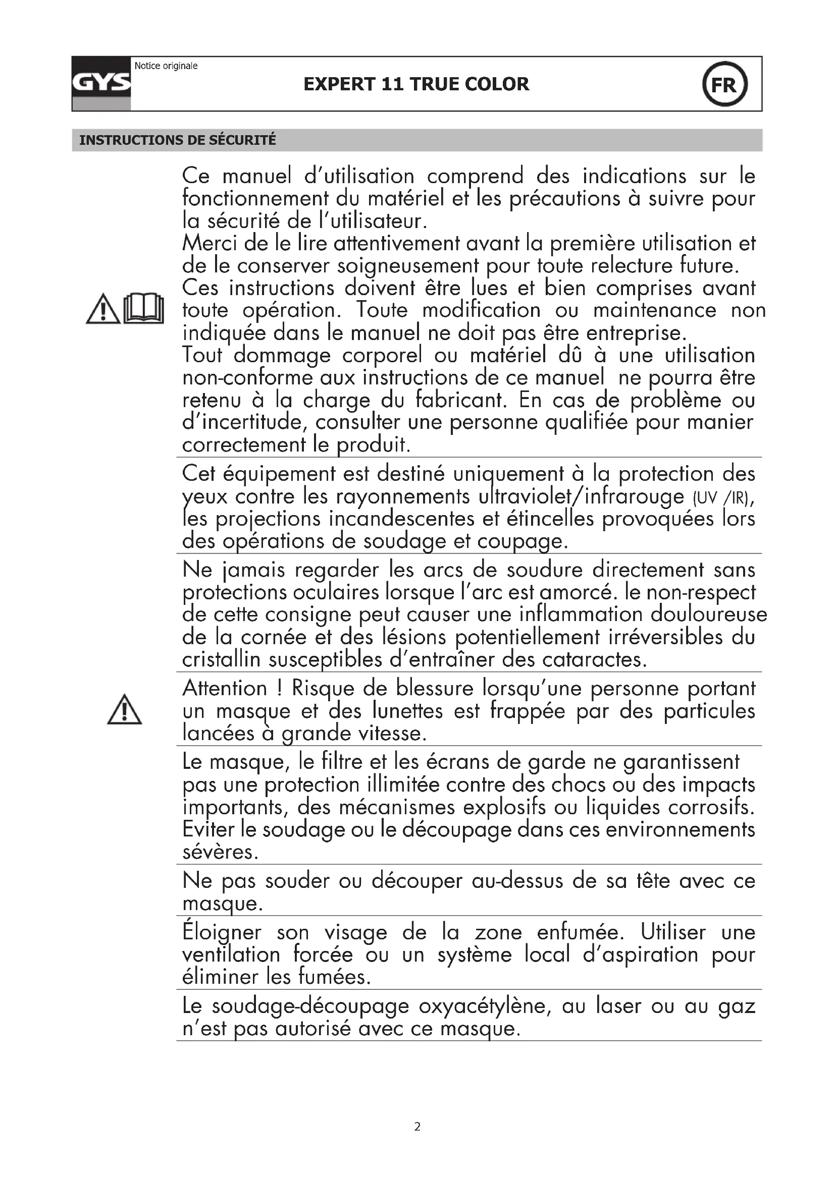 Notice originale FONCTIONNEMENT Le masque opto-électronique EXPERT LCD 11 TRUE COLOR commute instantanément de l’état clair à l’état foncé à l’amorçage de l’arc, et retourne à l’état clair lorsque l’arc s’arrête.