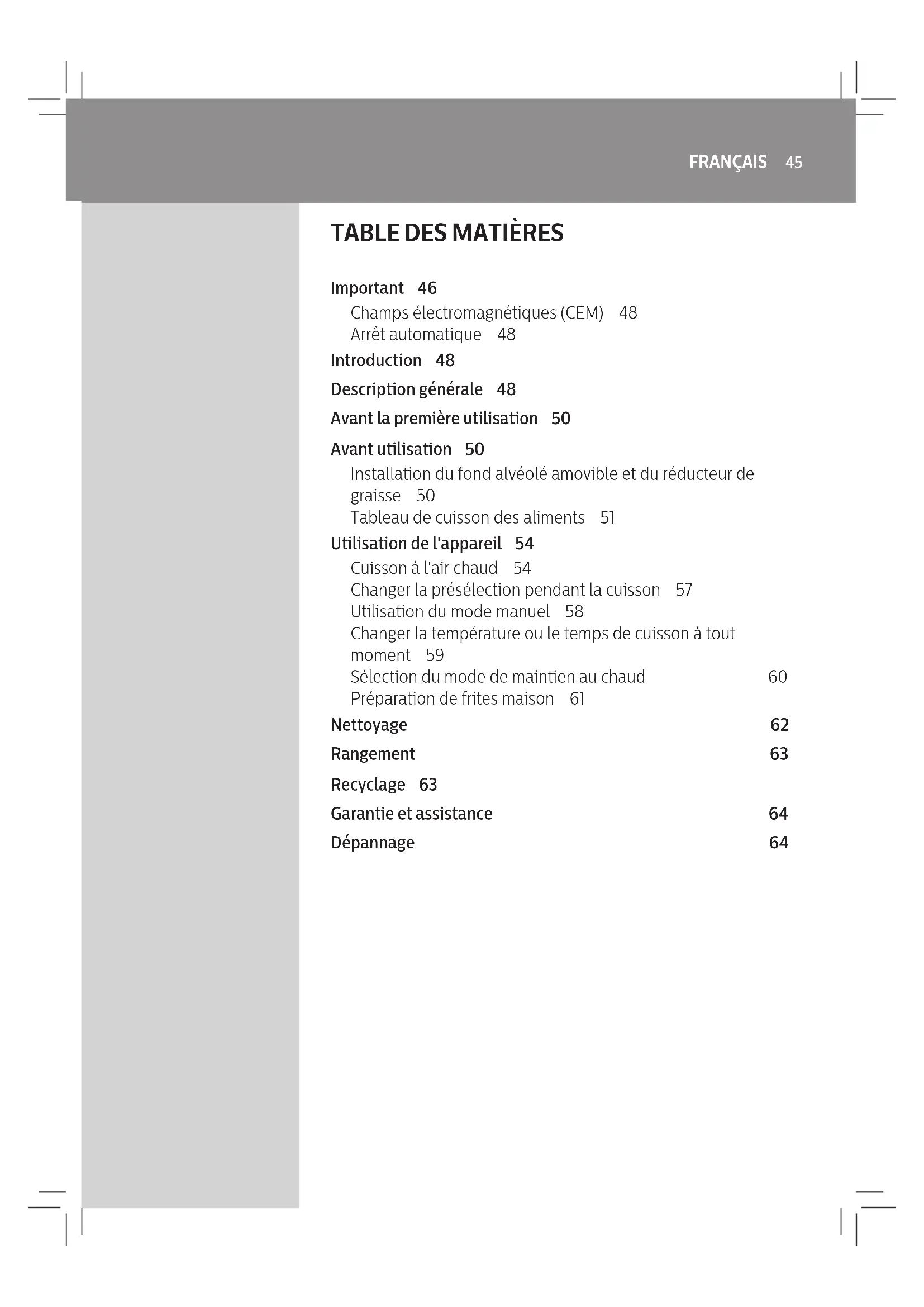 Important 46 Champs électromagnétiques (CEM) 48 Arrêt automatique 48 Introduction 48 Description générale 48 Avant la première utilisation 50 Avant utilisation 50 Installation du fond alvéolé amovible et du réducteur de graisse 50 Tableau de cuisson des aliments 51 Utilisation de l'appareil 54 Cuisson à l'air chaud 54 Changer la présélection pendant la cuisson 57 Utilisation du mode manuel 58 Changer la température ou le temps de cuisson à tout moment 59 Sélection du mode de maintien au chaud 60 Préparation de frites maison 61 Nettoyage 62 Rangement 63 Recyclage 63 Garantie et assistance 64 Dépannage 6446 FRANÇAIS Important Lisez attentivement ces informations importantes avant d'utiliser l'appareil et conservez-les pour un usage ultérieur. Danger - Ne plongez jamais l’appareil dans l’eau et ne le rincez pas sous le robinet. - Veillez à ne pas faire pénétrer d’eau ou d’autres liquides dans l’appareil an d’éviter tout risque d’électrocution. - Mettez toujours les aliments à frire dans le panier an d’éviter qu’ils entrent en contact avec les résistances. - Ne couvrez pas les entrées et sorties d’air pendant que l’appareil fonctionne. - Ne remplissez pas la cuve d’huile an d’éviter tout risque d’incendie. - N’utilisez pas l’appareil si la prise, le cordon d’alimentation ou l’appareil lui-même est endommagé. - Ne touchez jamais l’intérieur de l’appareil pendant qu’il fonctionne. - Veillez à ce que la quantité de nourriture utilisée ne dépasse pas le niveau maximal indiqué dans le panier. - Assurez-vous toujours que le dispositif de chaue est dégagé et exempt de tout aliment. Avertissement - Si le cordon d’alimentation est endommagé, il doit être remplacé par Philips, son agent de maintenance ou d’autres personnes disposant des qualications appropriées an d’éviter tout accident. - Branchez l’appareil uniquement sur une prise murale mise à la terre. Assurez-vous toujours que la che est correctement insérée dans la prise murale. - Cet appareil n’est pas destiné à être utilisé avec un minuteur externe ou un système de contrôle séparé. - Les surfaces accessibles peuvent chauer lorsque l’appareil fonctionne. - Cet appareil peut être utilisé par des enfants âgés de 8 ans ou plus, des personnes dont les capacités physiques, sensorielles ou intellectuelles sont réduites ou des personnes manquant d’expérience et de connaissances, à condition que ces enfants ou personnes soient sous surveillance ou qu’ils aient reçu des instructions quant à l’utilisation sécurisée de l’appareil et qu’ils aient pris connaissance des dangers encourus. Les enfants ne doivent pas jouer avec l’appareil. Le nettoyage et l’entretien ne doivent pas être réalisés par des enfants sauf s’ils sont âgés de plus de 8 ans et sous surveillance. - Tenez l’appareil et son cordon hors de portée des enfants de moins de 8 ans. - Ne placez pas l’appareil contre un mur ou contre d’autres appareils. Laissez un espace libre d’au moins 10 cm à l’arrière, sur les côtés et au- dessus de l’appareil. Ne placez jamais d’objets au-dessus de l’appareil. - Lors de la cuisson à l’air chaud, de la vapeur brûlante s’échappe des sorties d’air. Gardez les mains et le visage à distance de la vapeur et des sorties d’air. Faites également attention à la vapeur et à l’air chauds lorsque vous retirez la cuve de l’appareil. - N’utilisez jamais d’aliments légers ou du papier d’emballage dans l’appareil.47 FRANÇAIS - Les surfaces accessibles peuvent chauer lorsque l’appareil fonctionne. - Conservation des pommes de terre : la température doit être adaptée à la variété des pommes de terre entreposées et doit être supérieure à 6°C pour minimiser le risque d’exposition à l’acrylamide dans les aliments préparés. - Ne placez pas l’appareil sur ou à proximité d’une cuisinière chaude à gaz ou de tout type de cuisinière électrique ou de plaques de cuisson électriques, ou dans un four chaud. - Ne remplissez jamais la cuve d’huile. - Cet appareil est conçu pour être utilisé à des températures ambiantes comprises entre 5°C et 40°C. - Avant de brancher l’appareil, vériez que la tension indiquée sur l’appareil correspond à la tension supportée par le secteur local. - Tenez le cordon d’alimentation à l’écart des surfaces chaudes. - Ne placez jamais l’appareil sur des matériaux combustibles, comme une nappe ou des rideaux, ou à proximité de ce type de matériaux. - N’utilisez pas l’appareil à d’autres ns que celles indiquées dans le présent manuel et utilisez uniquement des accessoires Philips d’origine. - Ne laissez jamais l’appareil fonctionner sans surveillance. - La cuve, le panier et le réducteur de graisse deviennent chauds pendant et après l’utilisation de l’appareil. Manipulez-les toujours avec précaution. - Avant la première utilisation, nettoyez soigneusement toutes les pièces en contact avec des aliments. Reportez-vous aux instructions du manuel d’utilisation. Attention - Cet appareil est destiné uniquement à un usage domestique normal. Il n’a pas été conçu pour une utilisation dans des environnements tels que des cuisines destinées aux employés dans les entreprises, magasins et autres environnements de travail. Il n’est pas non plus destiné à être utilisé par des clients dans des hôtels, motels, chambres d’hôtes et autres environnements résidentiels. - Débranchez toujours l’appareil du secteur lorsqu’il n’est pas surveillé et avant de l’assembler, de le démonter, de le ranger ou de le nettoyer. - Posez l’appareil sur une surface horizontale, plane et stable. - S’il est employé de manière inappropriée, à des ns professionnelles ou semi-professionnelles, ou en non-conformité avec les instructions du mode d’emploi, la garantie devient caduque et Philips décli