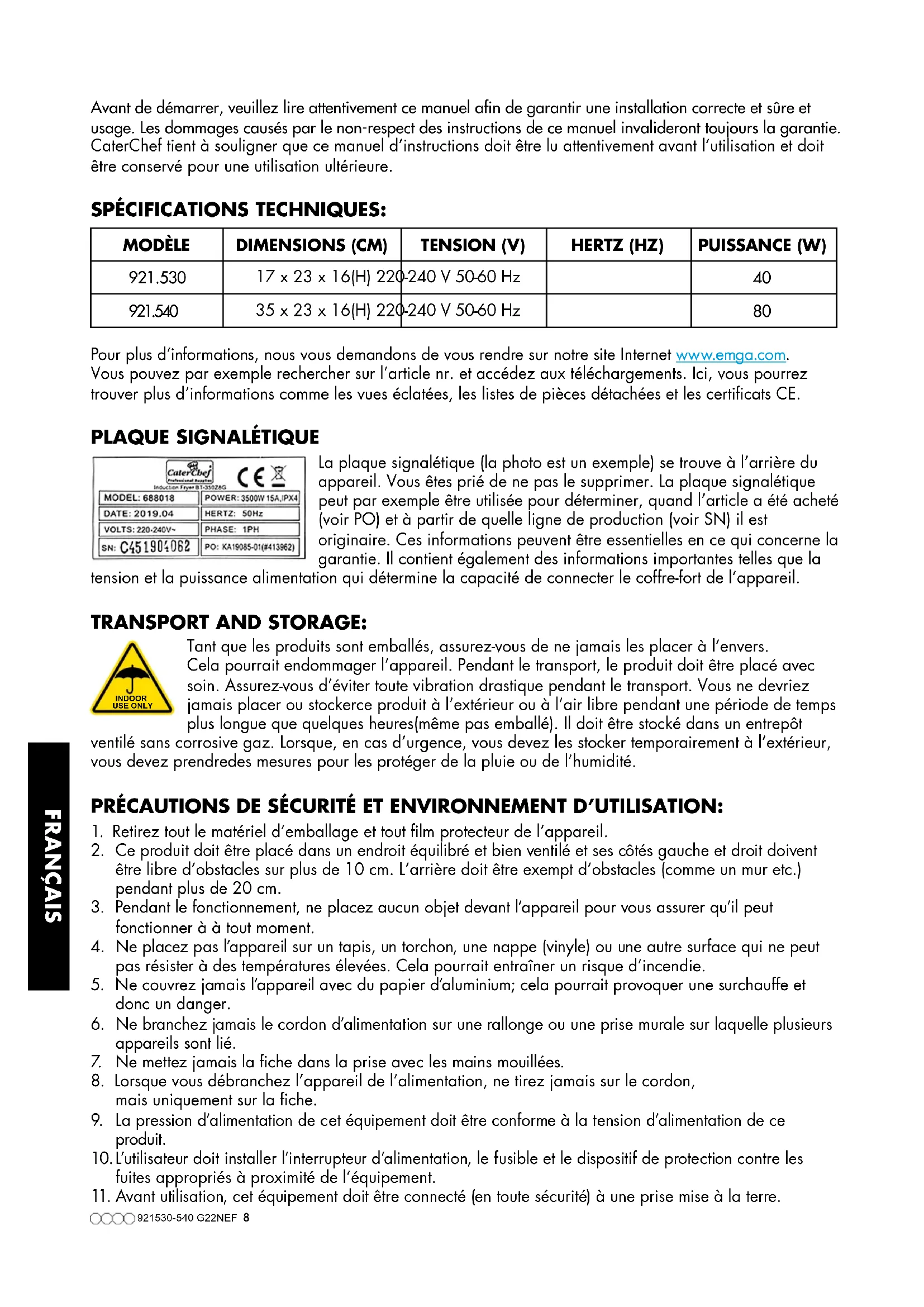 Avant de démarrer, veuilles lire attentivement ce manuel afin de garantir une installation correcte et sûre et usage. Les dommages causés par le non-respect des instructions de ce manuel invalideront toujours la garantie. CaterChef tient à souligner que ce manuel d'instructions doit être lu attentivement avant l'utilisation et doit être conservé pour une utilisation ultérieure.
