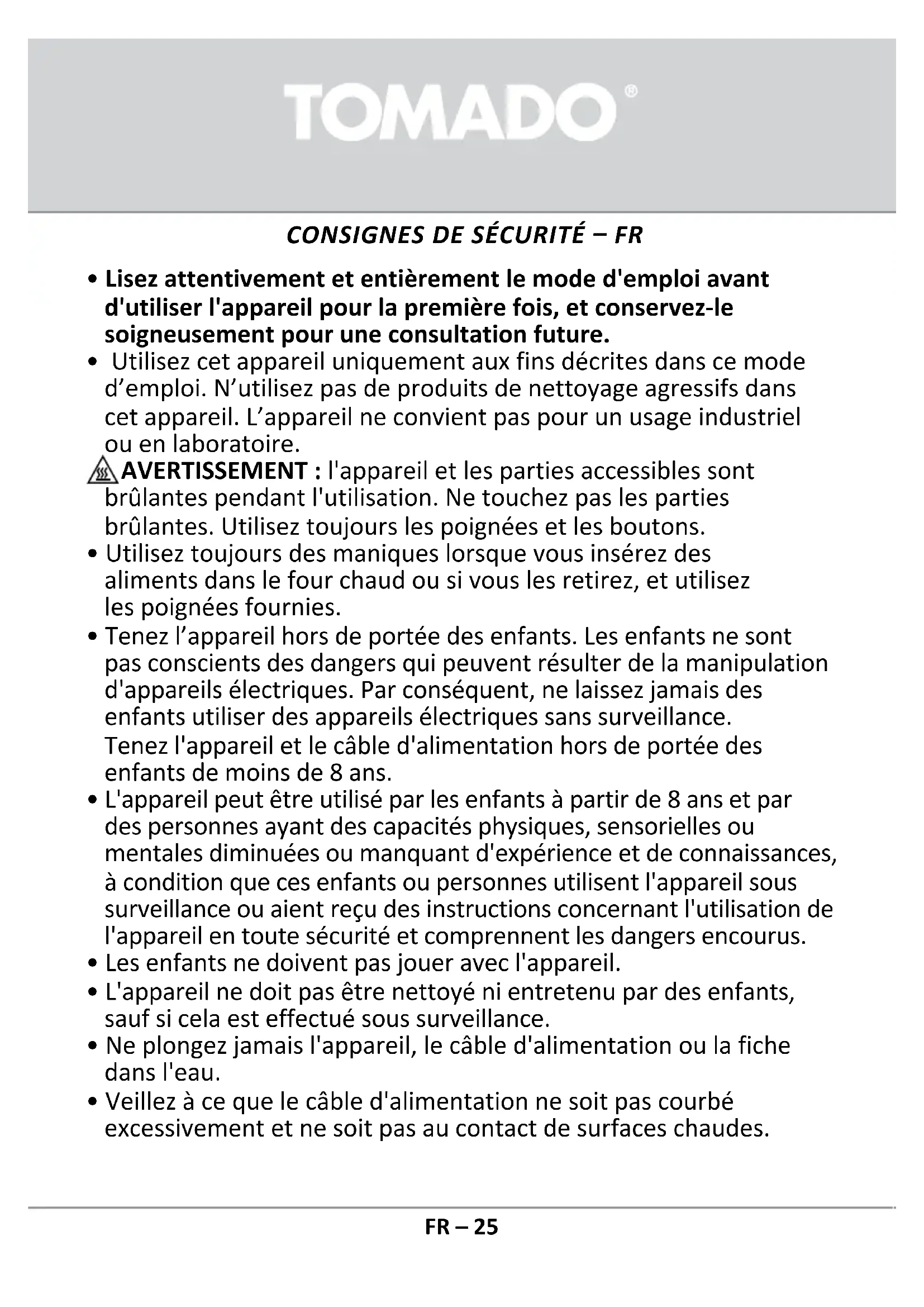 Ce produit est garanti pour une période de 24 mois. Votre garantie est valable lorsque le produit est utilisé conformément au mode d’emploi et pour l’usage auquel il est destiné. Par ailleurs, la preuve d’achat originale doit être fournie, en portant mention de la date d’achat, du nom du détaillant ainsi que du numéro d’article du produit. Pour connaître les conditions de garantie détaillées, rendez-vous sur notre site Internet : www.tomado.com/support