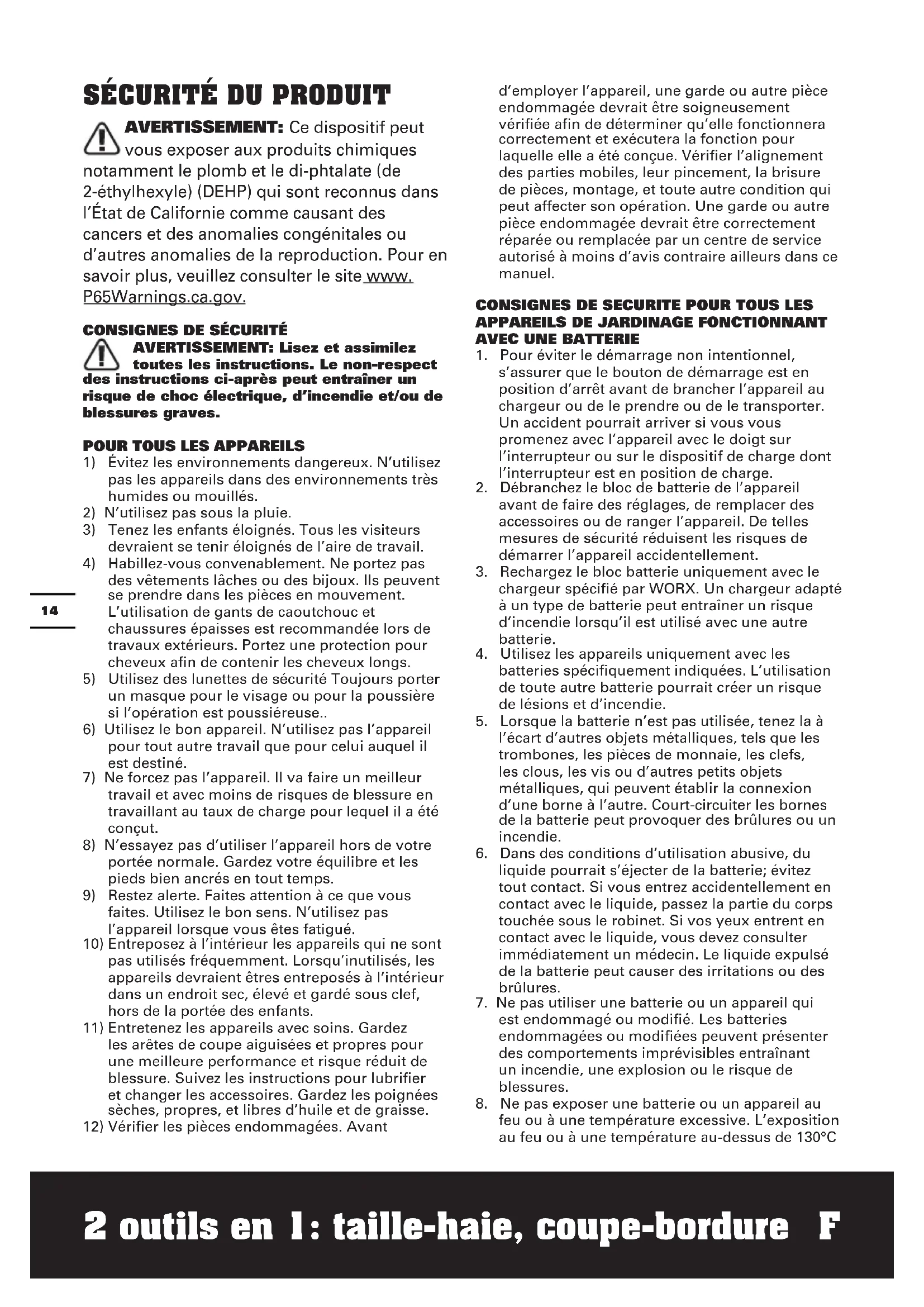 2 outils en 1: taille-haie, coupe-bordure ENTRETIEN Après chaque utilisation, déconnectez la batterie de l’appareil et évaluez les dommages. Votre outil électrique ne requiert pas de lubrification additionnelle ou entretien. À l’intérieur de votre outil électrique, il n’y a pas de pièces qui peuvent être entretenues par l’usager. Ne jamais utiliser d’eau ou des nettoyants chimiques pour nettoyer votre outil. Nettoyez à propre avec un linge sec. Toujours entreposer votre outil électrique dans un endroit sec hors d’atteinte des enfants. Gardez les fentes de ventilation du moteur propres. Gardez tous les contrôles de l’appareil libres de poussière.