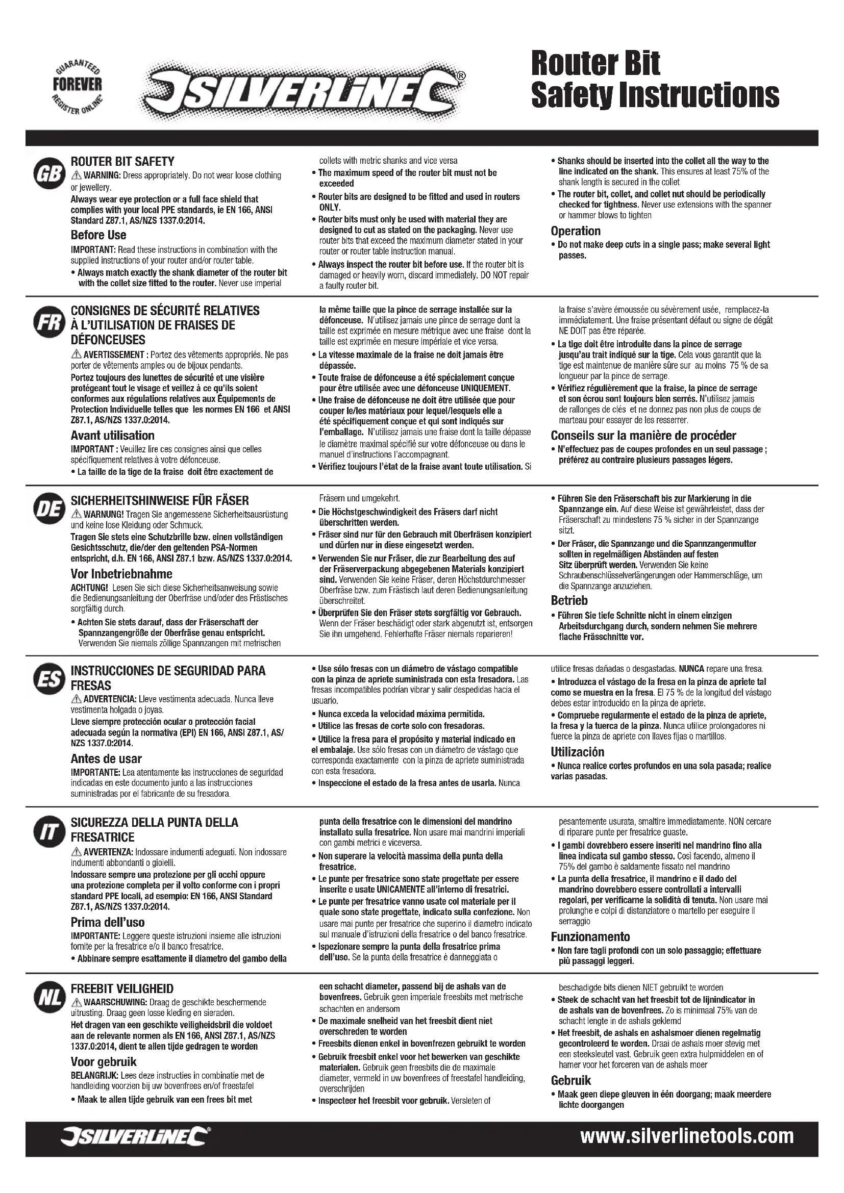 - Une fraise de défonceuse ne doit être utilisée que pour couper le/les matériaux pour lequel/lesquels elle a été spécifiquement conçue et qui sont indiqués sur l’emballage. N’utilisez jamais une fraise dont la taille dépasse le diamètre maximal spécifié sur votre défonceuse ou dans le manuel d’instructions l’accompagnant.