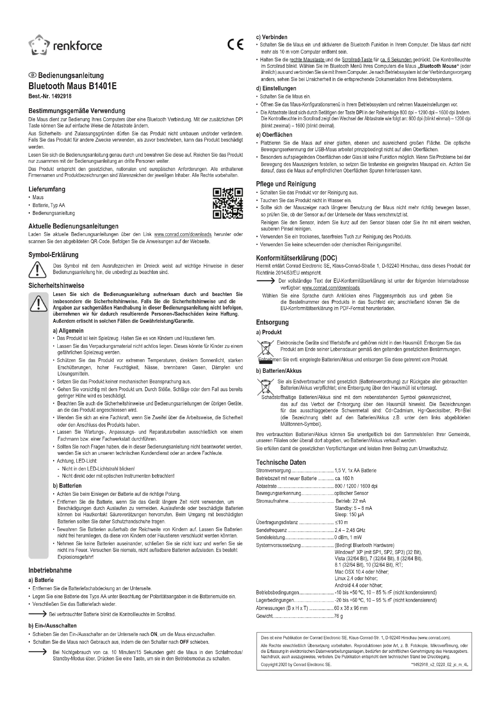 XP (avec SP1, SP2, SP3) (32 bits), Vista (32/64 bits), 7 (32/64 bits), 8 (32/64 bits), 8.1 (32/64 bits), 10 (32/64 bits), RT ; Mac OSX 10.4 ou plus récent ; Linux 2.4 ou plus récent ; Android 4.4 ou plus récent ; Conditions de service ....................... -10 à +50 °C, 10 - 85 % humidité relative (sans condensation) Conditions de stockage .................... -20 à +60 °C, 10 - 95 % humidité relative (sans condensation) Dimensions (L x H x P) ..................... 60 x 38 x 96 mm Poids .................................................76 g Mode d'emploi Souris Bluetooth B1401E Nº de commande 1492918 Utilisation prévue La souris sert à commander votre ordinateur via une connexion Bluetooth. La touche DPI supplémentaire vous permet de modier facilement l'échantillonnage. Pour des raisons de sécurité et d'homologation , toute transformation et/ou modication du produit est interdite. Si vous utilisez le produit à d'autres ns que celles décrites précédemment, cela risque d'endommager le produit. Lisez attentivement le mode d'emploi et conservez le. Ne transmettez le produit à des tiers qu'accompagné de son mode d'emploi. Le produit est conforme aux exigences des directives européennes et nationales en vigueur. Tous les noms d'entreprises et appellations de produits contenus dans ce mode d'emploi sont des marques déposées des propriétaires correspondants. Tous droits réservés. Contenu d'emballage