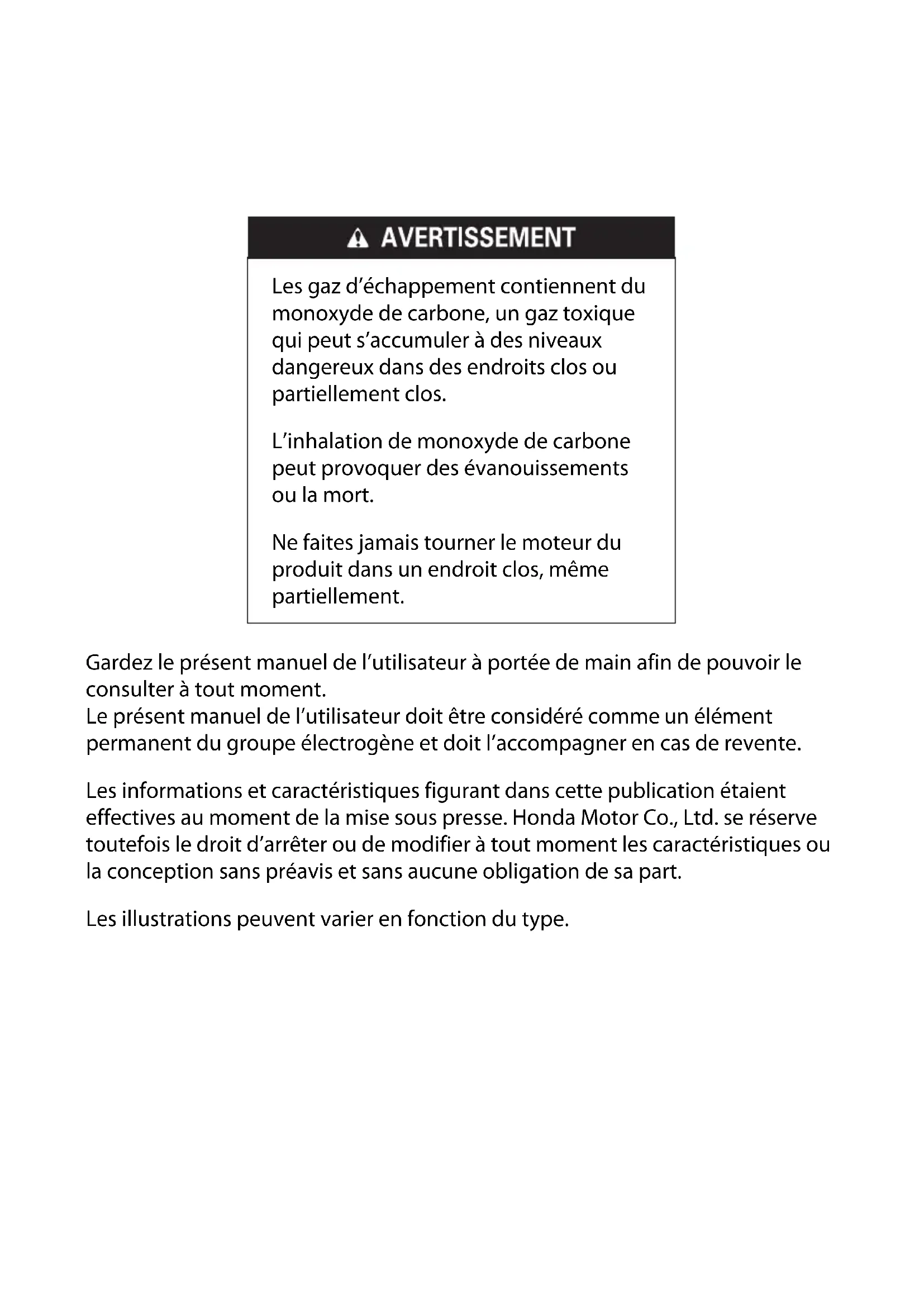 Notice originaleGardez le présent manuel de l’utilisateur à portée de main afin de pouvoir le consulter à tout moment. Le présent manuel de l’utilisateur doit être considéré comme un élément permanent du groupe électrogène et doit l’accompagner en cas de revente. Les informations et caractéristiques figurant dans cette publication étaient effectives au moment de la mise sous presse. Honda Motor Co., Ltd. se réserve toutefois le droit d’arrêter ou de modifier à tout moment les caractéristiques ou la conception sans préavis et sans aucune obligation de sa part. Les illustrations peuvent varier en fonction du type. Les gaz d’échappement contiennent du monoxyde de carbone, un gaz toxique qui peut s’accumuler à des niveaux dangereux dans des endroits clos ou partiellement clos. L’inhalation de monoxyde de carbone peut provoquer des évanouissements ou la mort. Ne faites jamais tourner le moteur du produit dans un endroit clos, même partiellement.1 INTRODUCTION Nous vous remercions d’avoir porté votre choix sur un groupe électrogène Honda. Nous désirons vous aider à faire le meilleur usage de votre nouveau groupe électrogène et à l’utiliser en sécurité. Vous trouverez dans ce manuel des informations sur la manière d’y parvenir : Lisez-le attentivement. Nous vous conseillons de lire le bulletin de garantie afin de bien comprendre l’étendue de la garantie et vos responsabilités en tant que propriétaire. Lorsque votre groupe électrogène a besoin d’une intervention prévue dans le programme d’entretien, n’oubliez pas que votre concessionnaire Honda est spécialement formé pour l’entretien des groupes électrogènes Honda. Votre concessionnaire réparateur Honda n’épargnera aucun effort pour vous donner satisfaction et se fera un plaisir de répondre à toutes vos questions et préoccupations.2 INTRODUCTION