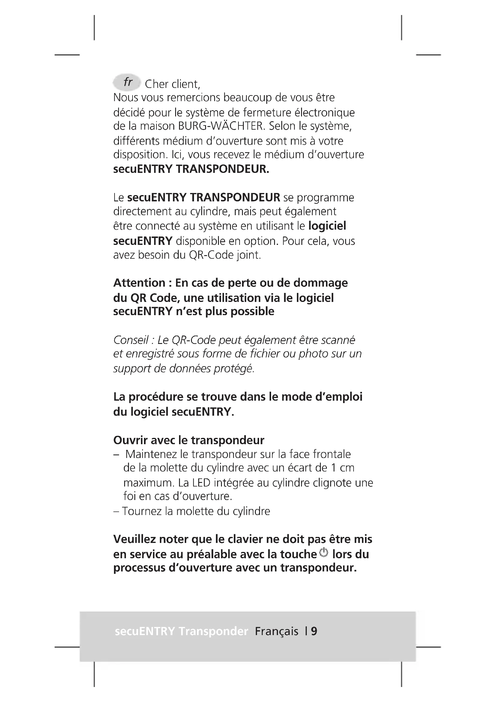 Nous vous remercions beaucoup de vous etrendecidé pour le système de fermeturelectroniquede la maison BURG-WACHTER. Selon le système,différents medium d'ouverture sont mis à votredisposition. Ici, vous receivez le medium d'ouverturesecuENTRY TRANSPONDEUR.