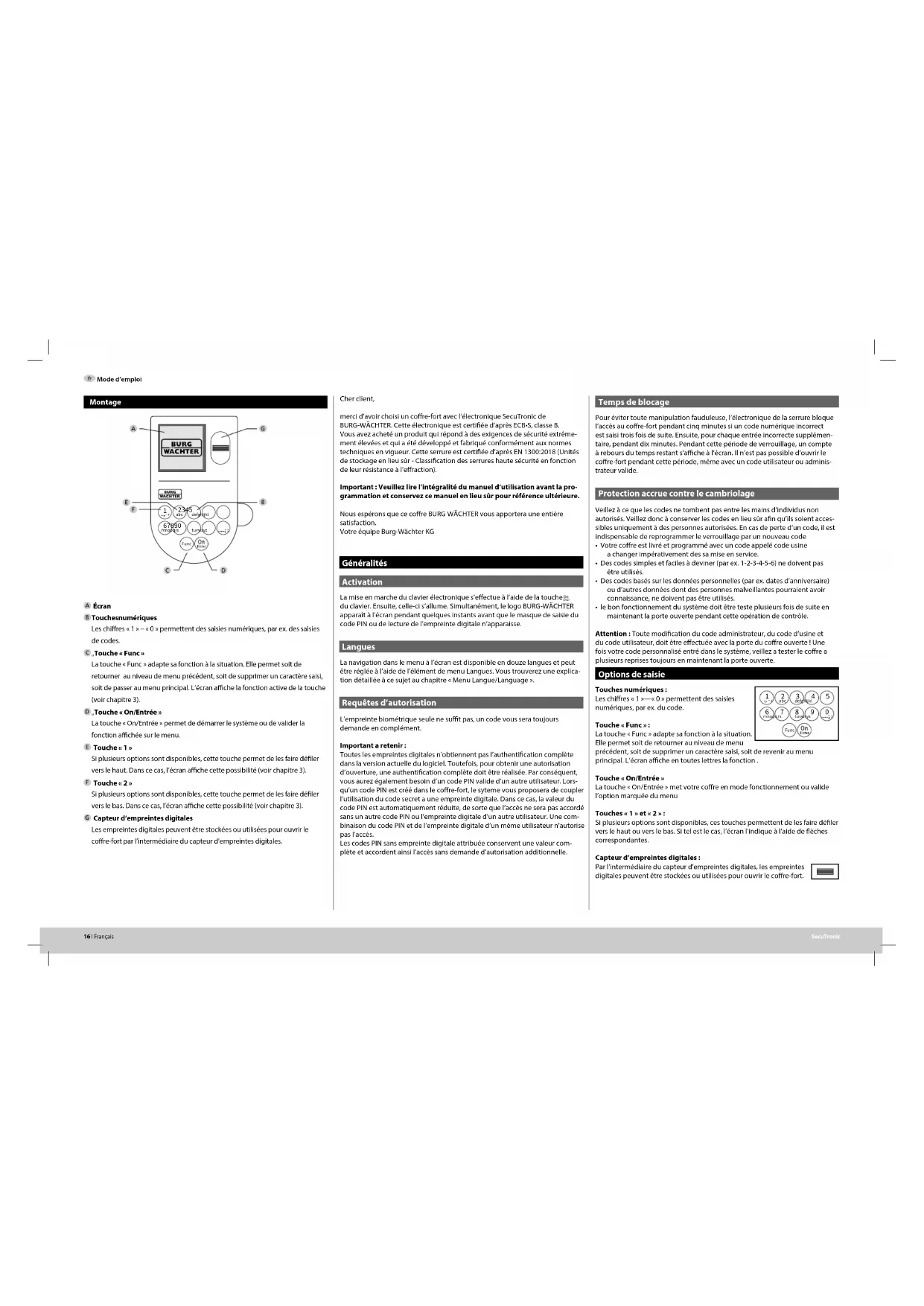 Merci d'eviter de toucher au coffre-fort avec l'électronique Securitice de BURG-WACHTER. Ce teselectronique est certificat d'apres PCB-S, clause B. Vous avez acheté un produit qui répond à des exigences de sécurité extrêmement élevées et qui a été développé et fabriqué conformément aux normes techniques en vigueur. Cette serrure est certificat d'après EN 1300:2018 (Unités de stockage en lieu sûr - Classification des serrures haute sécurité en fonction de leur résistance à l'effraction).