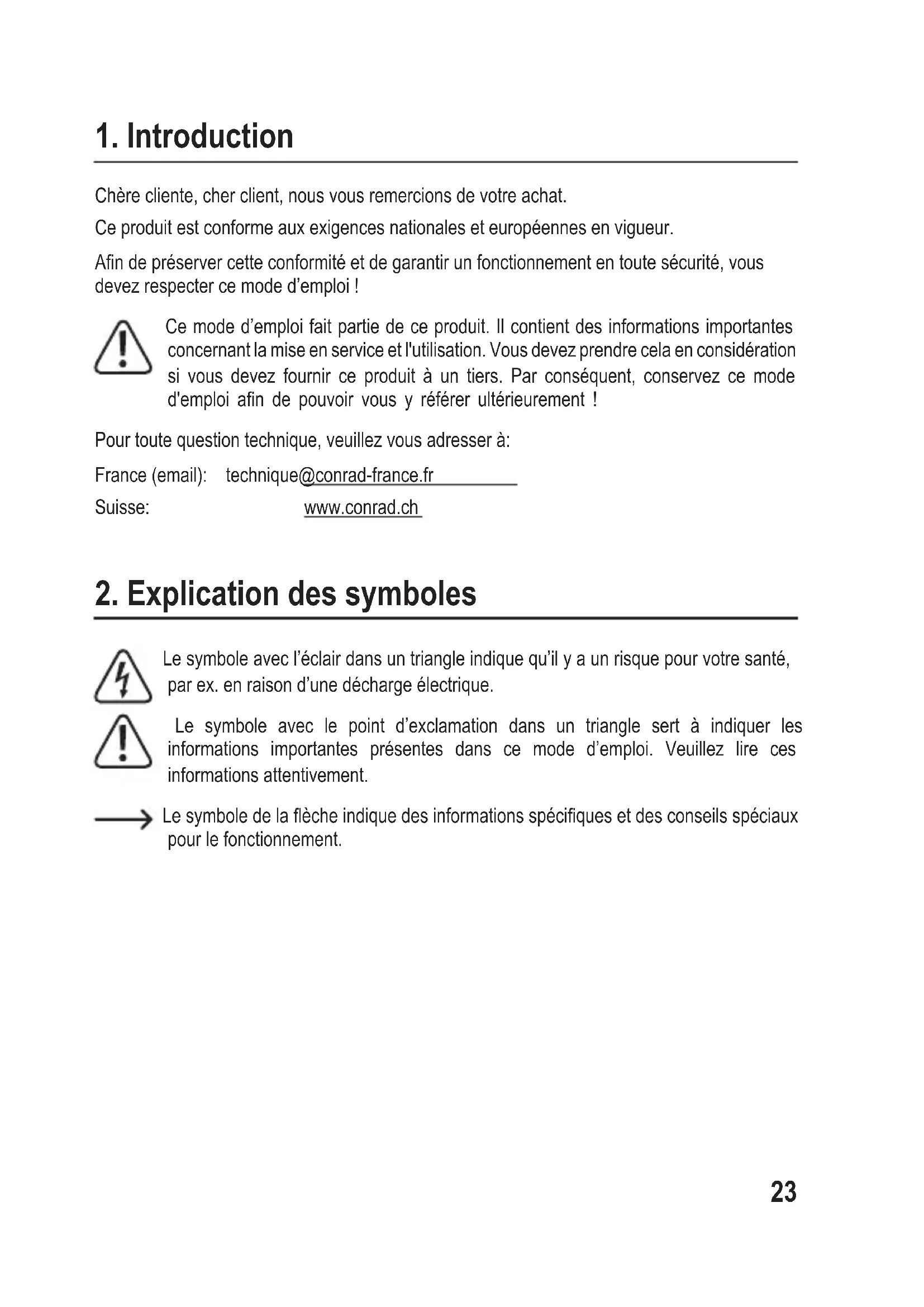 Chère cliente, cher client, nous vous remercions de votre achat. Ce produit est conforme aux exigences nationales et européennes en vigueur. An de préserver cette conformité et de garantir un fonctionnement en toute sécurité, vous devez respecter ce mode d’emploi ! Ce mode d’emploi fait partie de ce produit. Il contient des informations importantes concernant la mise en service et l'utilisation. Vous devez prendre cela en considération si vous devez fournir ce produit à un tiers. Par conséquent, conservez ce mode d'emploi an de pouvoir vous y référer ultérieurement ! Pour toute question technique, veuillez vous adresser à: France (email): technique@conrad-france.fr Suisse: www.conrad.ch