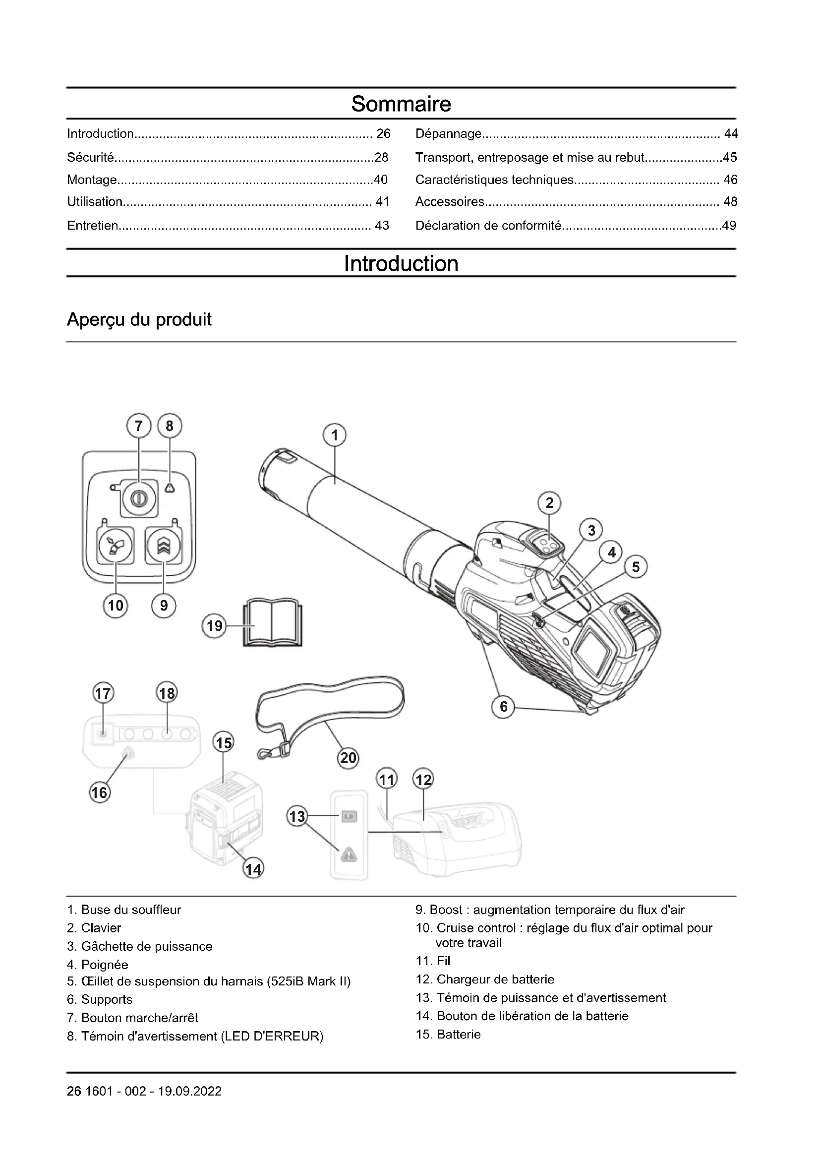 1. Buse du souffleur2. Clavier3. Gâchette de puissance4. Poignée5. Œillet de suspension du harnais (525iB Mark II)6. Supports7. Bouton marche/arrêt8. Témoin d'avertissement (LED D'ERREUR)9. Boost: augmentation temporaire du flux d'air10. Cruise control: réglage du flux d'air optimal pourvotre travail11. Fil12. Chargeur de batterie13. Témoin de puissance et d'avertissement14. Bouton de libération de la batterie15. Batterie26 1601 - 002 - 19.09.202216. Témoin d'avertissement (LED D'ERREUR)