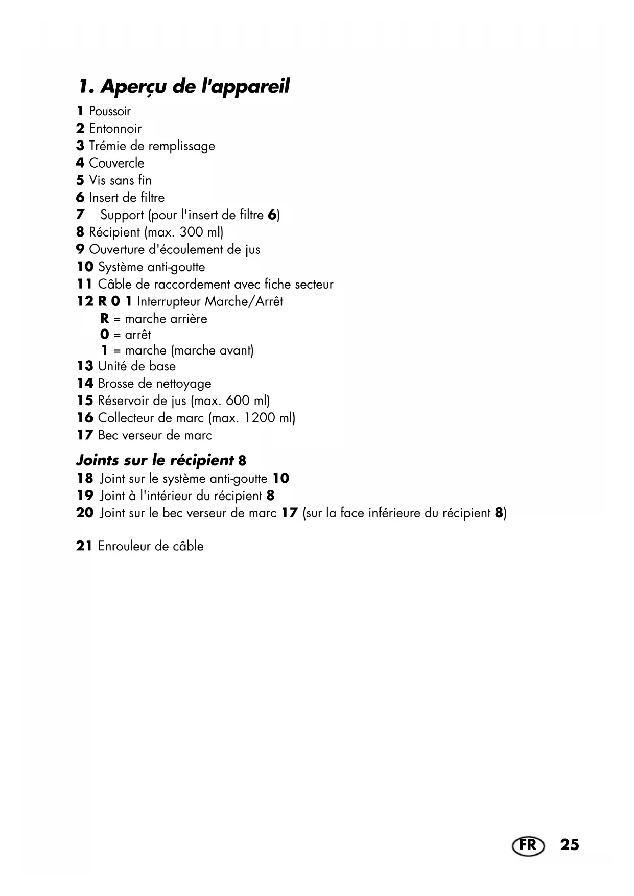 1 Poussoir 2 Entonnoir 3 Trémie de remplissage 4 Couvercle 5 Vis sans fin 6 Insert de filtre 7 Support (pour l'insert de filtre6) 8 Récipient (max. 300 ml) 9 Ouverture d'écoulement de jus 10 Système anti-goutte 11 Câble de raccordement avec fiche secteur 12 R 0 1 Interrupteur Marche/Arrêt R = marche arrière 0 = arrêt 1 = marche (marche avant) 13 Unité de base 14 Brosse de nettoyage 15 Réservoir de jus (max. 600 ml) 16 Collecteur de marc (max. 1200 ml) 17 Bec verseur de marc Joints sur le récipient8 18 Joint sur le système anti-goutte10 19 Joint à l'intérieur du récipient8 20 Joint sur le bec verseur de marc17 (sur la face inférieure du récipient8) 21 Enrouleur de câble __384945_2107_Slow Juicer_B1.book Seite 25 Montag, 15. November 2021 11:05 1126