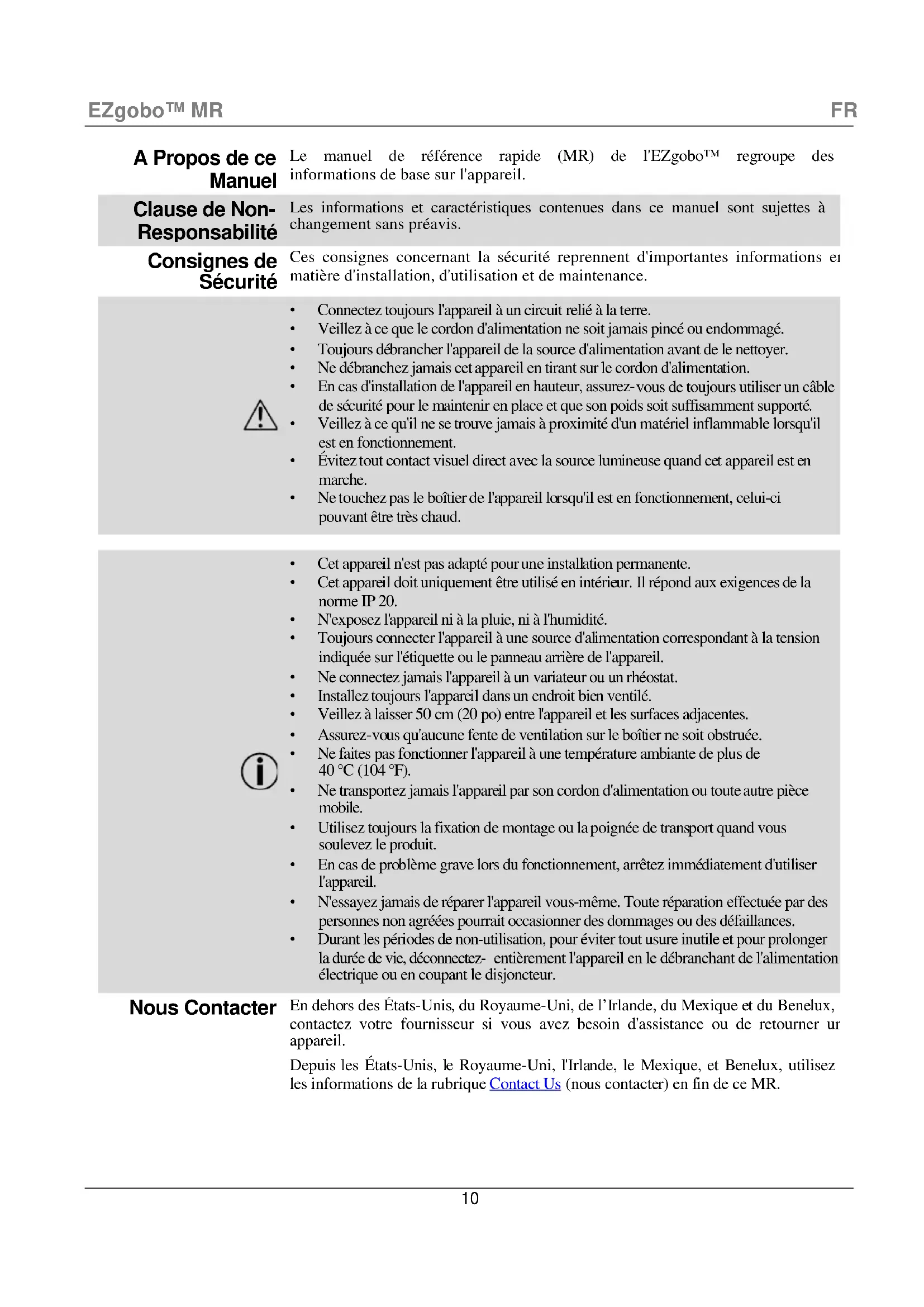 - Durant les périodes de non-utilisation, pour éviter tout usure inutile et pour prolonger la durée de vie, déconnectez- entièrement l'appareil en le débranchant de l'alimentation électrique ou en coupant le disjoncteur. Nous Contacter En dehors des États-Unis, du Royaume-Uni, de l’Irlande, du Mexique et du Benelux, contactez votre fournisseur si vous avez besoin d'assistance ou de retourner un appareil. Depuis les États-Unis, le Royaume-Uni, l'Irlande, le Mexique, et Benelux , utilisez les informations de la rubrique Contact Us (nous contacter) en fin de ce MR.EZgobo™ MR FR