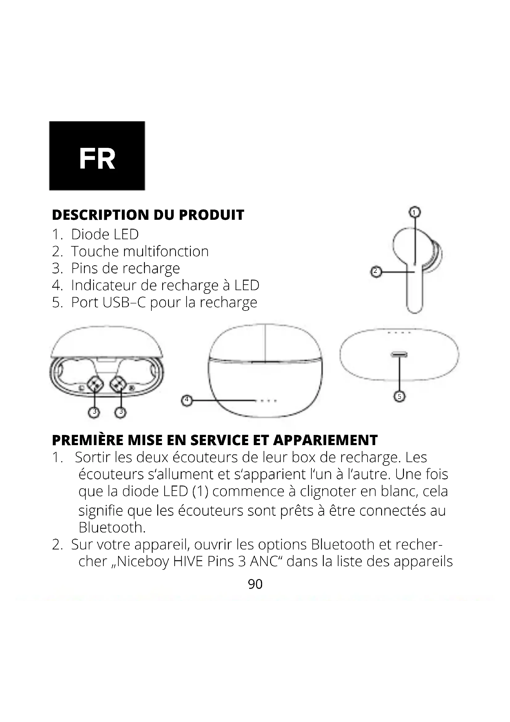 de recharge, ils s‘allumeront et s‘apparieront automatique- ment l‘un à l‘autre. Le processus sera ainsi terminé. SPÉCIFICATIONS BT: 5.3 Bande de fréquence: 2,4 GHz Radiofréquence: ≤ 2,5 mW Prols BT: HFP, A2DP, AVRCP Codecs compatibles: AAC, SBC Niveau de protection: IPX496 Portée de la transmission: 10 m Reproducteur: 10 mm Fréquence: 20 Hz – 20 kHz Sensibilité: 118 ± 1,5 dB Temps de lecture correspondant à une recharge: jusqu‘à 10 heures Temps de lecture total: jusqu‘à 40 heures Capacité de la batterie des écouteurs: 50 mAh Capacité de la batterie du box de recharge: 400 mAh Assistants vocaux: Siri et Google Assistant Appariement multipoint: OUI CONTENU DE L‘EMBALLAGE: Écouteurs Niceboy HIVE Pins 3 ANC Box de recharge Embouts de rechange Câble USB–C Notice