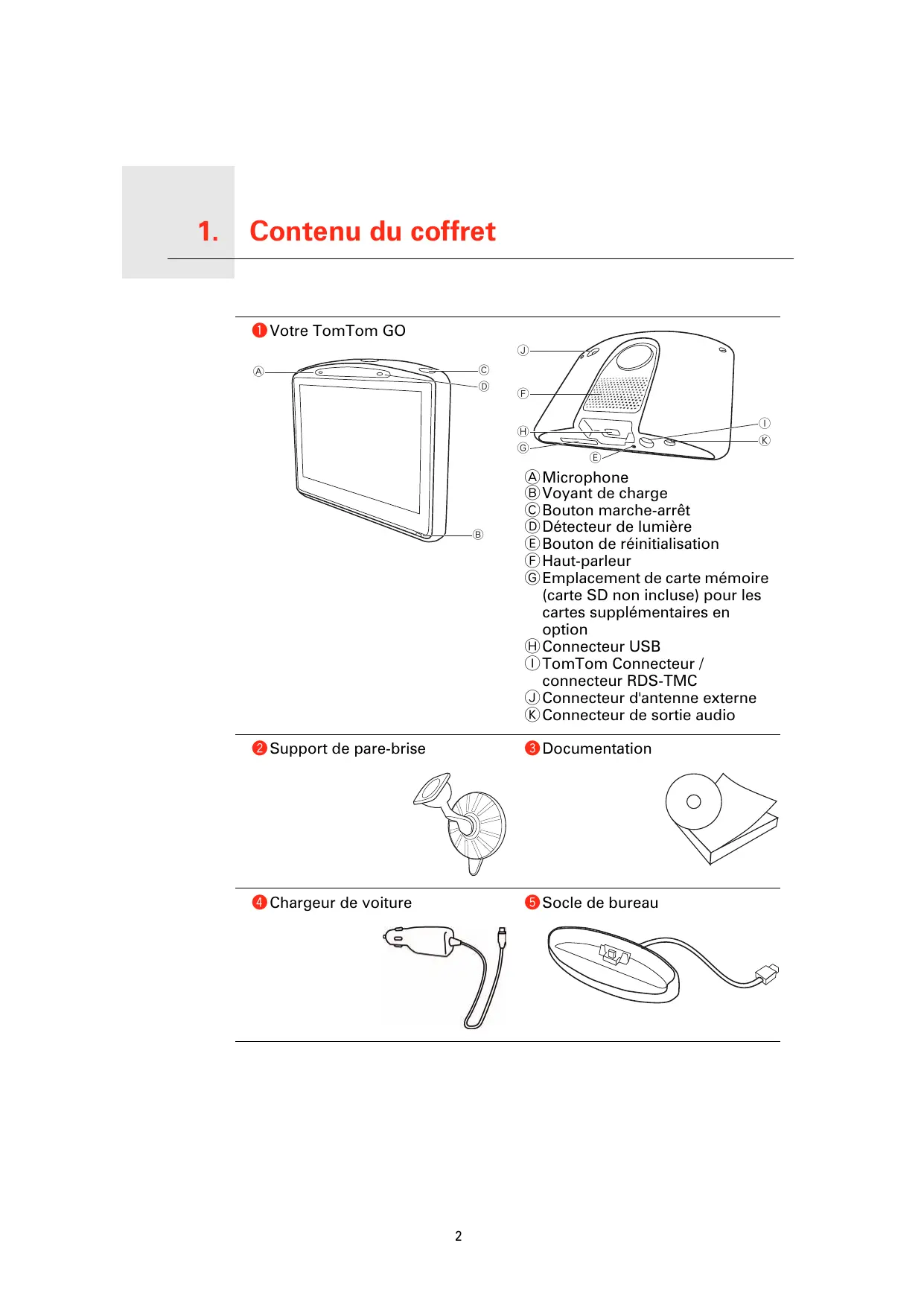 A Microphone B Voyant de charge C Bouton marche-arrêt D Détecteur de lumière E Bouton de réinitialisation F Haut-parleur G Emplacement de carte mémoire (carte SD non incluse) pour les cartes supplémentaires en option H Connecteur USB I TomTom Connecteur / connecteur RDS-TMC J Connecteur d'antenne externe K Connecteur de sortie audio b Support de pare-brise c Documentation d Chargeur de voiture e Socle de bureau
