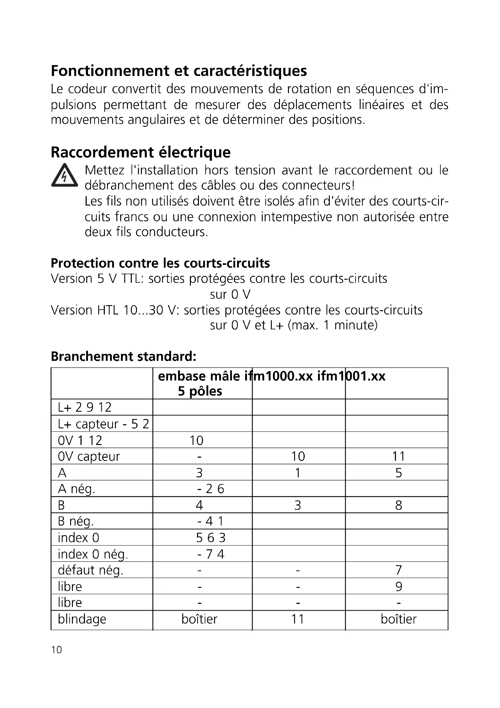 embase mâle ifm1000.xx ifm1001.xx 5 pôles L+ 2 9 12 L+ capteur - 5 2 0V 1 12 10 0V capteur - 10 11 A315 A nég. - 2 6 B438 B nég. - 4 1 index 0 5 6 3 index 0 nég. - 7 4 défaut nég. - - 7 libre - - 9 libre - - - blindage boîtier 11 boîtierVous trouvez également le branchement sur le capot du boîtier. S'il existe un raccordement spécial, le codeur doit être branché comme indiqué sur l'étiquette du boîtier. Les fils L+ (capteur) et 0 V (capteur) sont reliés en interne à la tension d'alimentation. Lorsque des modules électroniques régulant la tension d'alimentation sont utilisés, ces fils peuvent servir de fils de test. En cas de non-utilisation ces fils doivent être reliés à la tension d'alimentation ou être isolés. En fonction de la version, le raccordement électrique se fait par le câble ou par des câbles à se procurer séparément. Lorsque des câbles appropriés sont utilisés, la longueur maximale du câble est de 100 m pour la version 5 V TTL et de 300 m pour la ver- sion 10...30 V HTL.