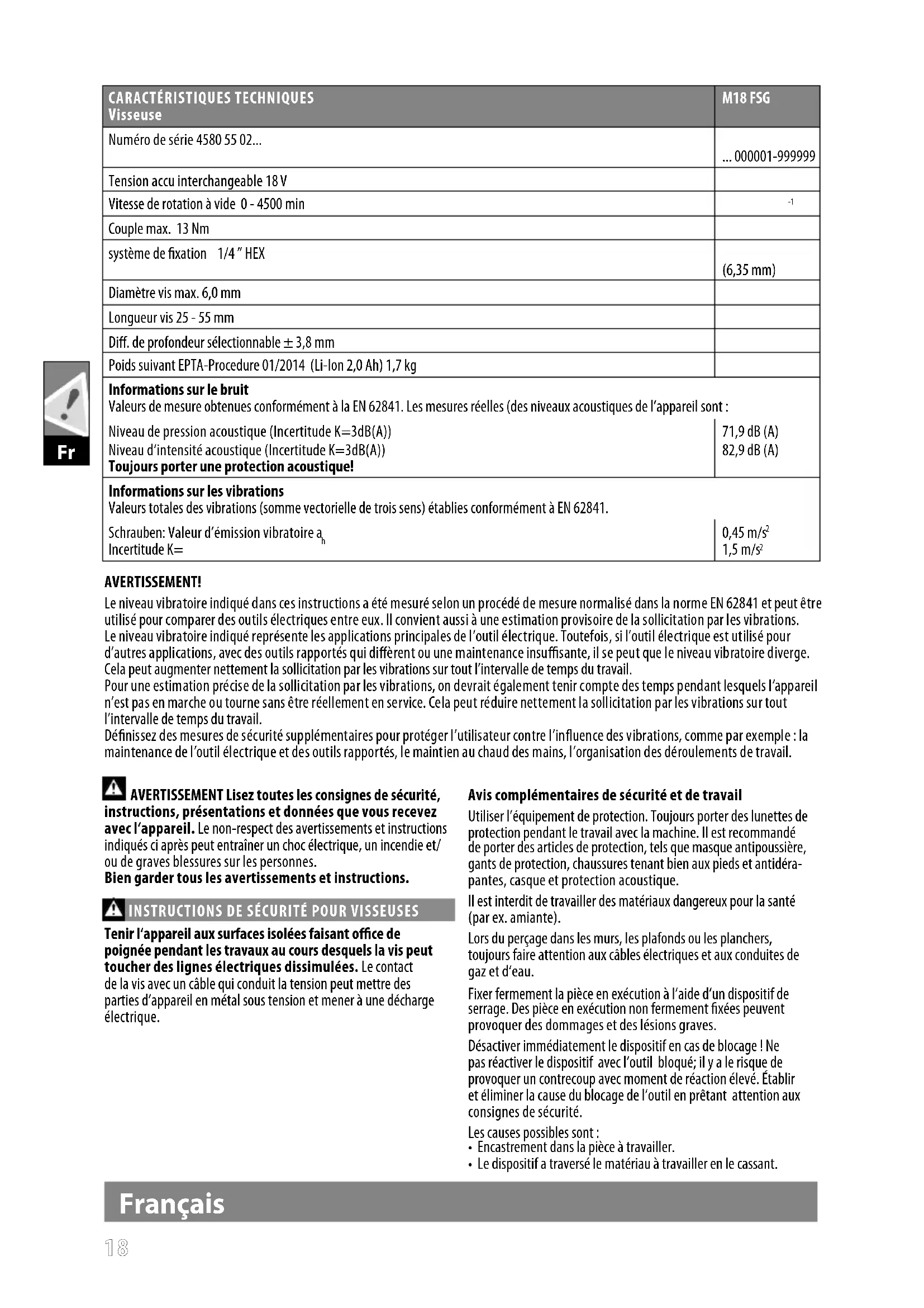 Visseuse M18 FSG Numéro de série 4580 55 02... ... 000001-999999 Tension accu interchangeable 18 V Vitesse de rotation à vide 0 - 4500 min