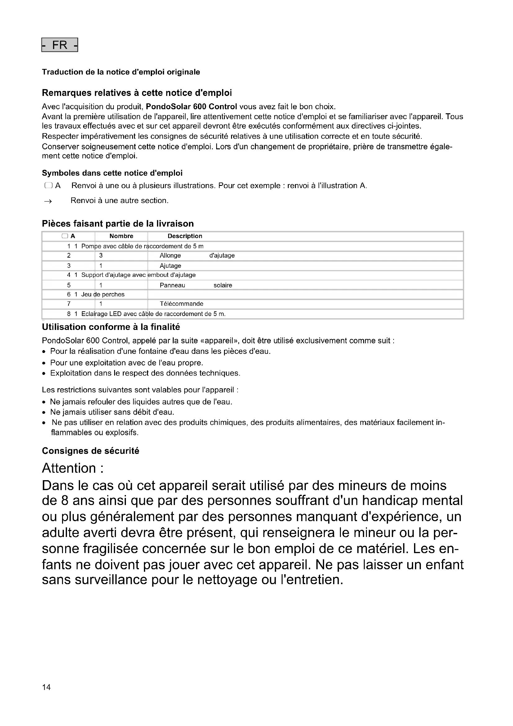 Utilisation conforme à la finalité PondoSolar 600 Control, appelé par la suite «appareil», doit être utilisé exclusivement comme suit : Pour la réalisation d'une fontaine d'eau dans les pièces d'eau. Pour une exploitation avec de l'eau propre. Exploitation dans le respect des données techniques.