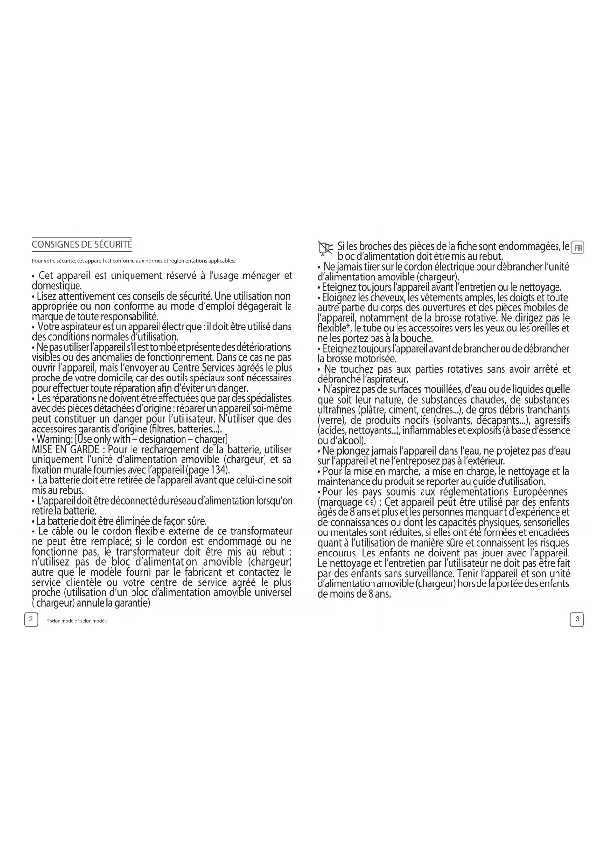 Le chargeur chaue Il s’agit d’un phénomène tout à fait normal. L’aspirateur peut rester connecté au chargeur en permanence sans aucun risque.Le chargeur est connecté mais votre appareil ne charge pas Le chargeur est mal connecté à l’appareil ou est défaillant. Vériez que le chargeur est bien connecté ou adressez-vous à un Centre de Services Agréés pour faire changer le chargeur.Votre appareil s’arrête pendant son fonctionnement et le(s) voyant(s) de charge clignote(ent) très rapidement Votre appareil est peut-être en surchaue. Arrêtez l’appareil et laisser l’appareil refroidir pendant au moins 1 heure.L’appareil s’est arrêté après que le voyant de charge ait clignoté L’appareil est déchargé. Rechargez l’aspirateur.L’électrobrosse fonctionne moins bien ou fait un bruit anormal La brosse rotative ou le exible sont obstrués.Arrêtez l’aspirateur et nettoyez-les.La brosse est usée.Adressez-vous à un Centre de Services Agréés pour faire changer la brosse.La courroie est usée.Adressez-vous à un Centre de Services Agréés pour faire changer la courroie.L’électrobrosse s’arrête en cours d’aspiration La sécurité thermique a fonctionné.Arrêtez l’aspirateur. Vériez qu’aucun élément ne gêne la rotation de la brosse, si c’est le cas retirez l’élément bloquant et nettoyez l’électrobrosse, puis remettez l’aspirateur en marche.Votre aspirateur aspire moins bien, fait du bruit, sie Le tube ou le exible sont partiellement bouchés. Débouchez-les.Le réceptacle à poussière est plein. Videz-le et nettoyez-le.Le bac à poussière est mal positionné. Replacez-le correctement. La tête d’aspiration est encrassée. Démontez l’électrobrosse et nettoyez-la.Le ltre de protection du moteur est saturé.Nettoyez-le.A la mise en charge de l’aspirateur, le(s) voyant(s) de charge clignote(nt) en rouge ou très rapidement.Ce n’est pas le bon chargeur ou celui-ci est défectueux.Adressez-vous à un Centre de Services Agréés pour faire changer le chargeur.La LED rouge du produit clignote pendant l’usageLa brosse de la tête d’aspiration est bloquée.Arrêtez l’aspiration et vériez qu’aucun élément ne bloque la rotation de la brosse.Température de la batterie est trop élevée.Laissez reposer le produit 30min. Si le problème persiste, changez la batterie.Les connecteurs du tube et/ou de la tête d’aspiration sont sales ou endommagés.Nettoyez à l’aide d’un chion les connecteurs du tube et de la tête d’aspiration.Le moteur d’aspiration est hors d’usage.Adressez-vous à un Centre de Services Agréés pour faire réparer votre appareil. Merci de conserver ce mode d’emploi.EN