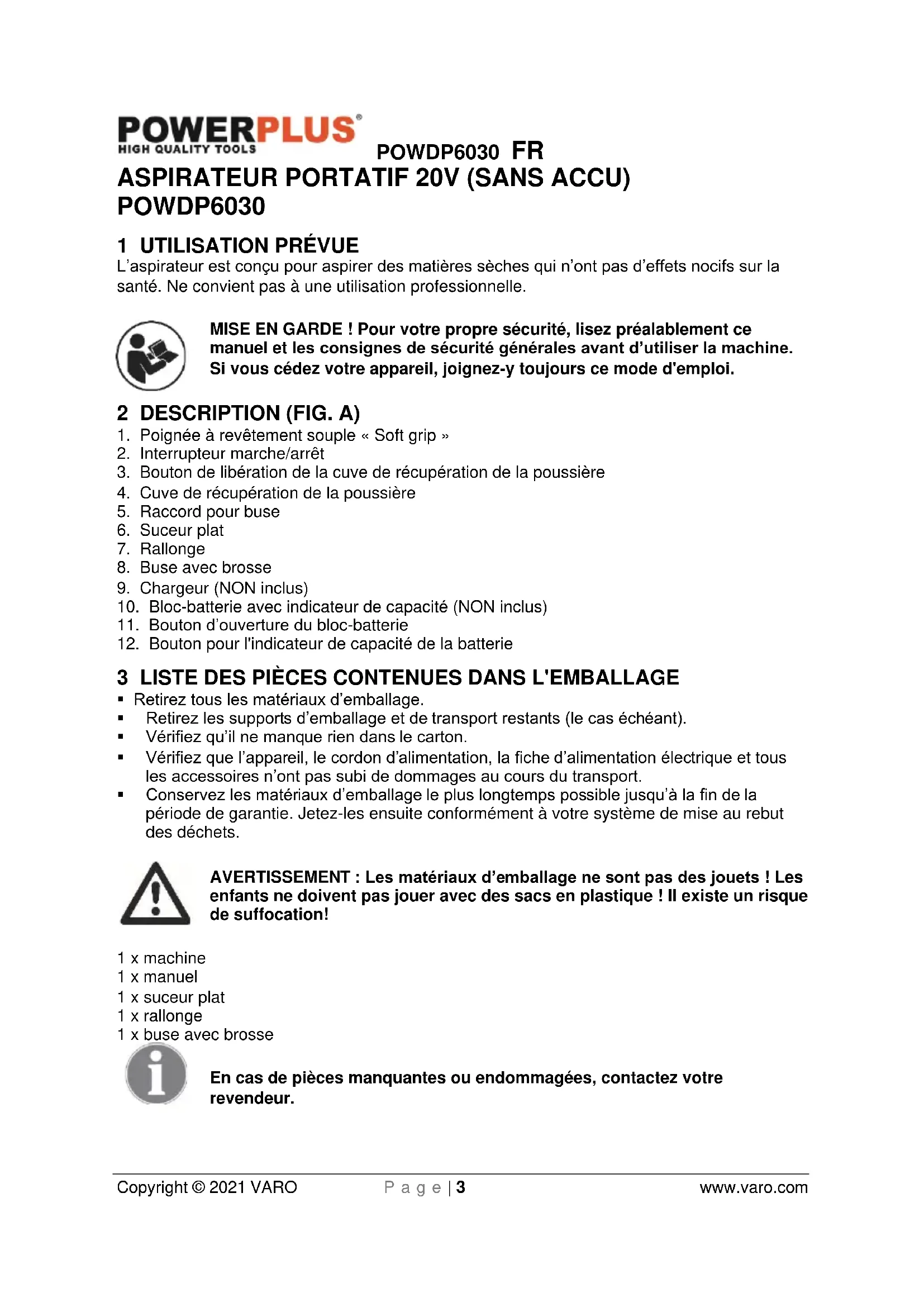 POWDP6030 - Aspirateur PowerPlus - Notice d'utilisation et mode d'emploi gratuit