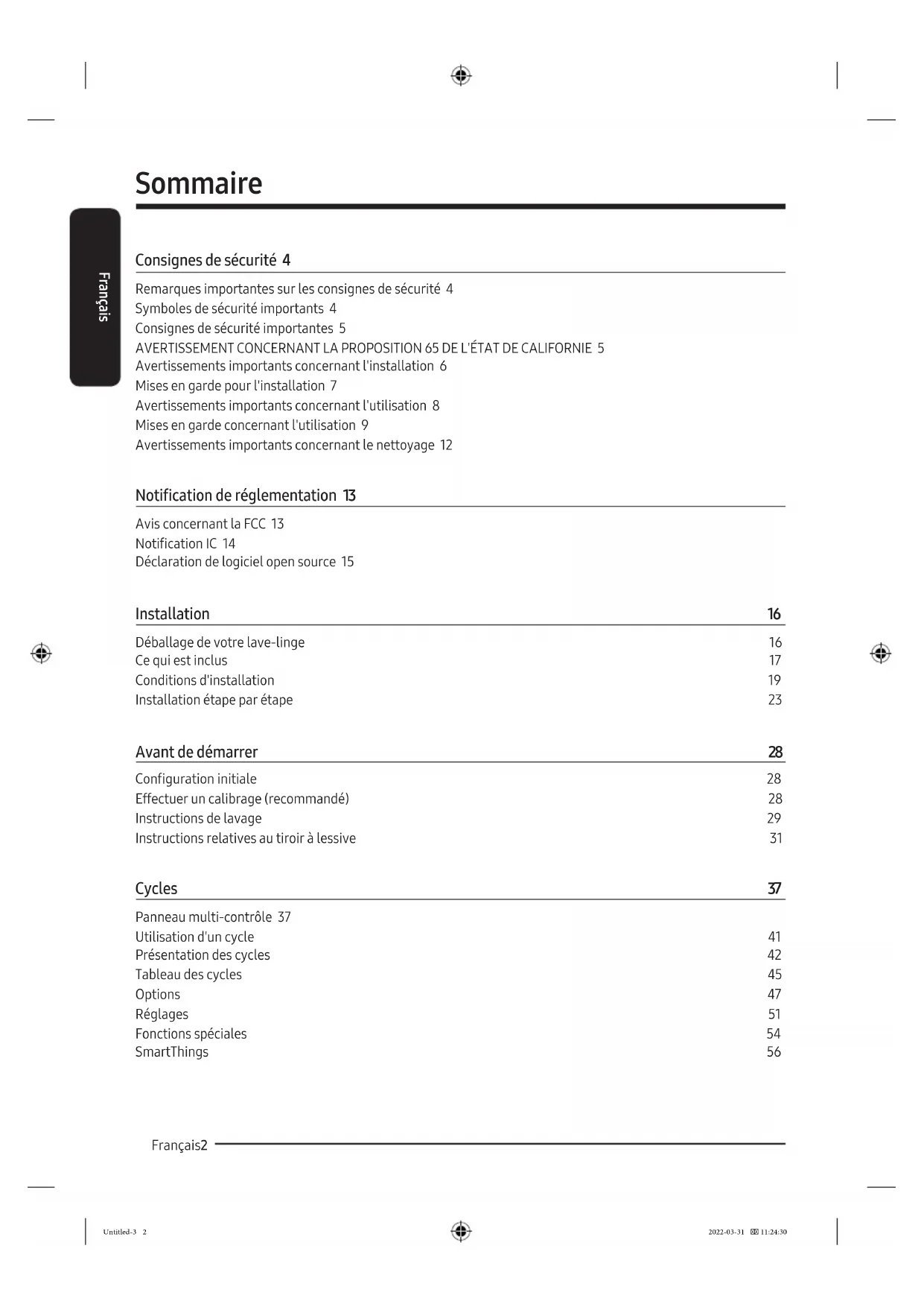 Visits by a Service Engineer to explain functions, maintenance, or installation are not covered by warranty. Please contact your Samsung call agent for help with any of these issues. Untitled-1 75 2022-03-31 11:19:31Scan this with your smartphone QUESTIONS OR COMMENTS? COUNTRY CALL OR VISIT US ONLINE AT U.S.A 1-800-SAMSUNG (726-7864) www.samsung.com/us/support CANADA 1-800-SAMSUNG(726-7864) www.samsung.com/ca/support (English) www.samsung.com/ca_fr/support (French) DC68-04386A-00 Untitled-1 76 2022-03-31 11:19:32Lave-linge Manuel d'utilisation WF46BG65**A*/WF53BB89**A* Untitled-3 1 2022-03-31 11:24:30Français Français2 Sommaire Consignes de sécurité 4 Remarques importantes sur les consignes de sécurité 4 Symboles de sécurité importants 4 Consignes de sécurité importantes 5 AVERTISSEMENT CONCERNANT LA PROPOSITION 65 DE L'ÉTAT DE CALIFORNIE 5 Avertissements importants concernant l'installation 6 Mises en garde pour l'installation 7 Avertissements importants concernant l'utilisation 8 Mises en garde concernant l'utilisation 9 Avertissements importants concernant le nettoyage 12 Notication de réglementation 13 Avis concernant la FCC 13 Notication IC 14 Déclaration de logiciel open source 15 Installation 16 Déballage de votre lave-linge 16 Ce qui est inclus 17 Conditions d'installation 19 Installation étape par étape 23 Avant de démarrer 28 Conguration initiale 28 Effectuer un calibrage (recommandé) 28 Instructions de lavage 29 Instructions relatives au tiroir à lessive 31 Cycles 37 Panneau multi-contrôle 37 Utilisation d'un cycle 41 Présentation des cycles 42 Tableau des cycles 45 Options 47 Réglages 51 Fonctions spéciales 54 SmartThings 56 Untitled-3 2 2022-03-31 11:24:30Français Français 3 Entretien 57 Nettoyage+ 57 Vidange d'urgence 58 Nettoyage 59 Reprise du fonctionnement après du gel 63 Mesures en cas de période d'inutilisation prolongée 63 Nettoyer l'extérieur 64 Nettoyer l'intérieur 64 Dépannage 65 Contrôles à effectuer 65 Codes d'information 70 Caractéristiques techniques 72 Tableau des symboles textiles 72 Protection de l'environnement 73 Déclaration de conformité 73 Fiche de caractéristiques techniques 74 Untitled-3 3 2022-03-31 11:24:30Français