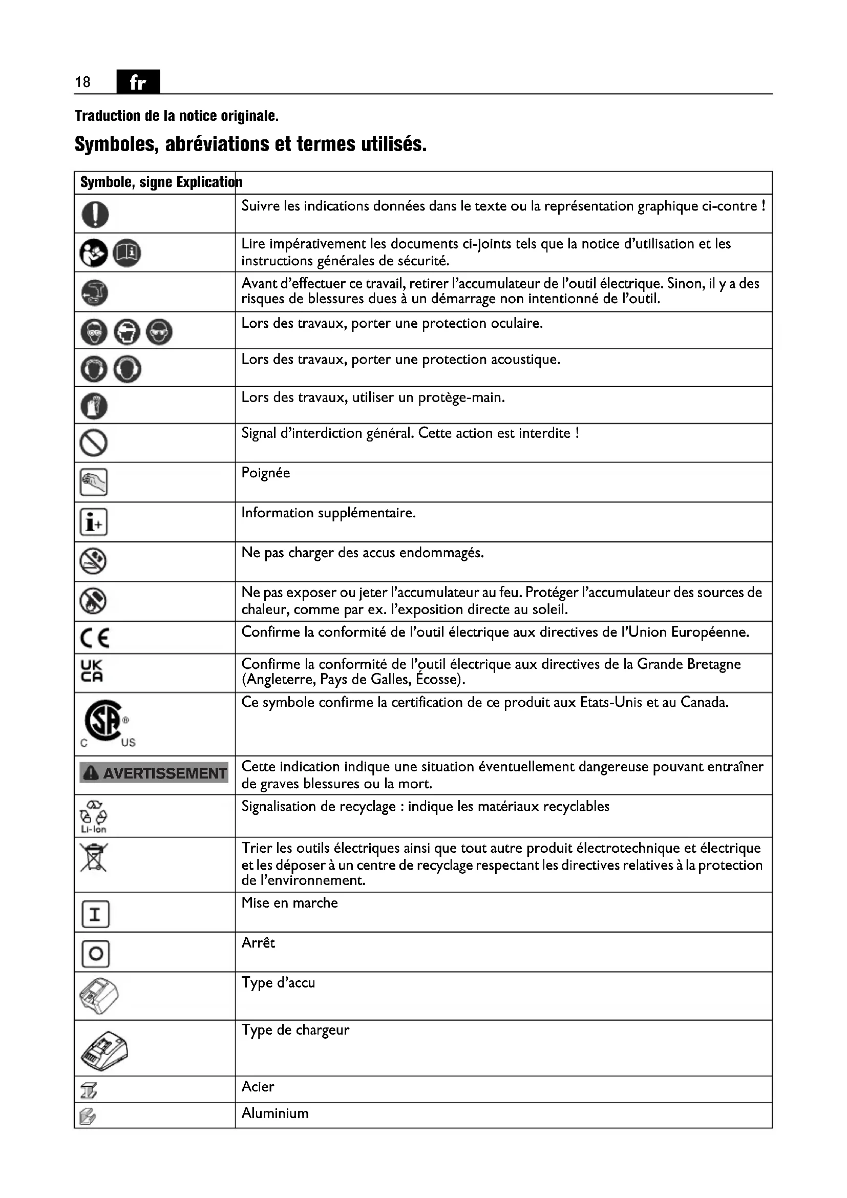 Traduction de la notice originale. Symboles, abréviations et termes utilisés. Symbole, signe Explication Suivre les indications données dans le texte ou la représentation graphique ci-contre ! Lire impérativement les documents ci-joints tels que la notice d’utilisation et les instructions générales de sécurité. Avant d’effectuer ce travail, retirer l’accumulateur de l’outil électrique. Sinon, il y a des risques de blessures dues à un démarrage non intentionné de l’outil. Lors des travaux, porter une protection oculaire. Lors des travaux, porter une protection acoustique. Lors des travaux, utiliser un protège-main. Signal d’interdiction général. Cette action est interdite ! Poignée Information supplémentaire. Ne pas charger des accus endommagés. Ne pas exposer ou jeter l’accumulateur au feu. Protéger l’accumulateur des sources de chaleur, comme par ex. l’exposition directe au soleil. Confirme la conformité de l’outil électrique aux directives de l’Union Européenne. Confirme la conformité de l’outil électrique aux directives de la Grande Bretagne (Angleterre, Pays de Galles, Écosse). Ce symbole confirme la certification de ce produit aux Etats-Unis et au Canada. Cette indication indique une situation éventuellement dangereuse pouvant entraîner de graves blessures ou la mort. Signalisation de recyclage : indique les matériaux recyclables Trier les outils électriques ainsi que tout autre produit électrotechnique et électrique et les déposer à un centre de recyclage respectant les directives relatives à la protection de l’environnement. Mise en marche Arrêt Type d’accu Type de chargeur Acier Aluminium AVERTISSEMENT19