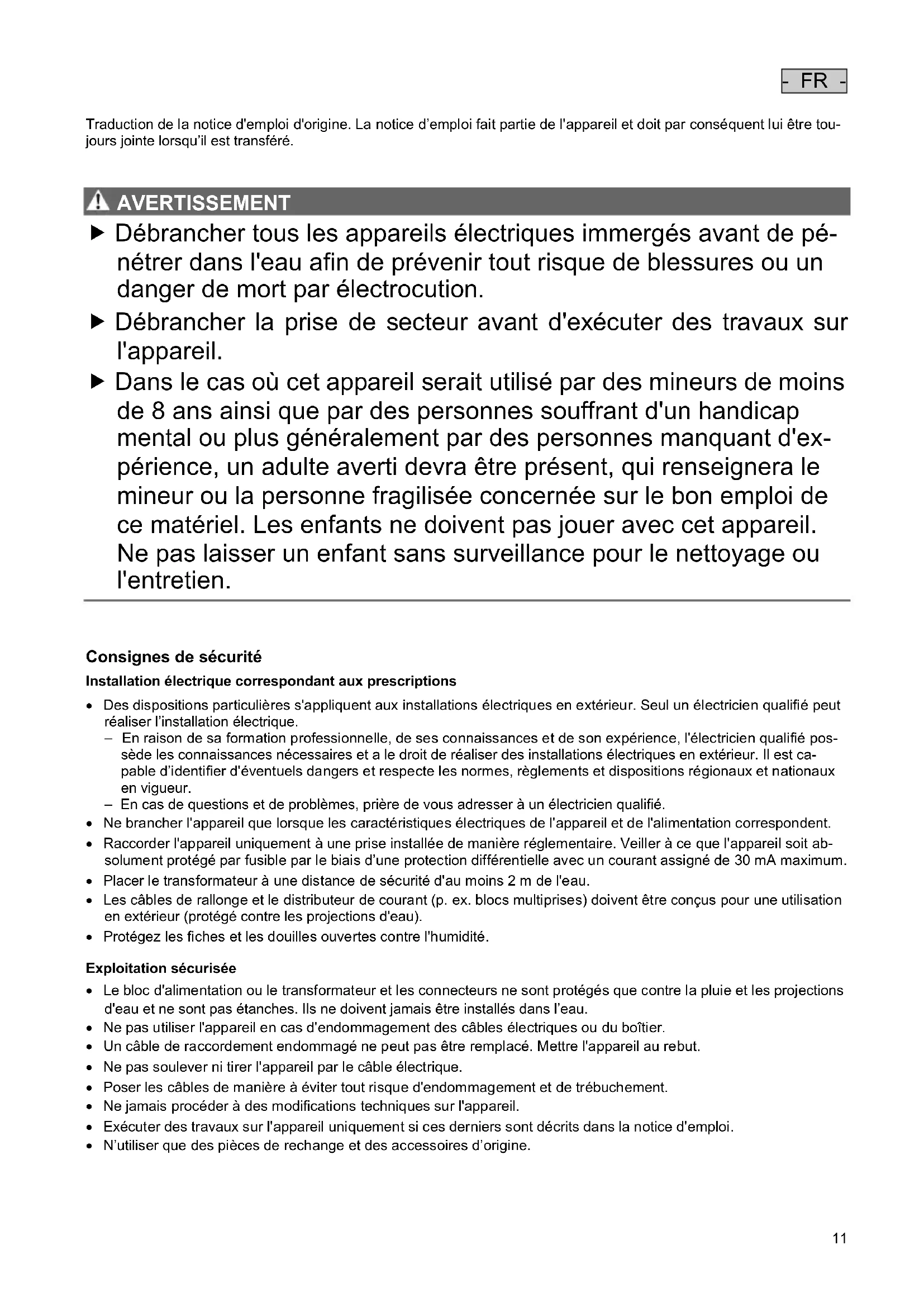 AVERTISSEMENT Débrancher tous les appareils électriques immergés avant de pé- nétrer dans l'eau afin de prévenir tout risque de blessures ou un danger de mort par électrocution. Débrancher la prise de secteur avant d'exécuter des travaux sur l'appareil. Dans le cas où cet appareil serait utilisé par des mineurs de moins de 8 ans ainsi que par des personnes souffrant d'un handicap mental ou plus généralement par des personnes manquant d'ex- périence, un adulte averti devra être présent, qui renseignera le mineur ou la personne fragilisée concernée sur le bon emploi de ce matériel. Les enfants ne doivent pas jouer avec cet appareil. Ne pas laisser un enfant sans surveillance pour le nettoyage ou l'entretien.