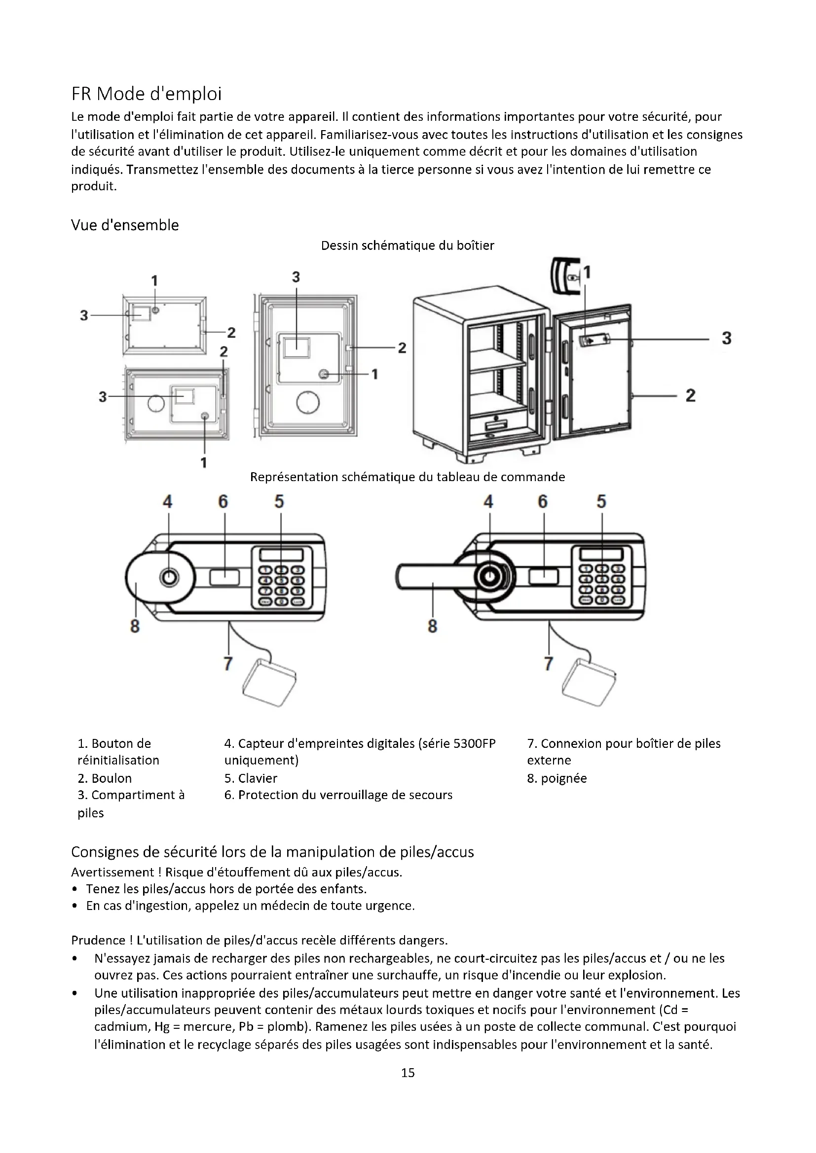 - 1 mode d'emploi Réglage Ouvrir le coffre-fort pour la première fois / Ouvrir le coffre-fort avec la clé de secours : Variante 1 : Ouverture par alimentation électrique externe Insérez les piles dans le compartiment à piles externe. Connectez le boîtier de batterie externe à l'interface du coffre-fort (voir "Représentation schématique du tableau de commande") Ouvrir le coffre-fort avec un code utilisateur/une empreinte digitale (uniquement pour la série 5300FP) Variante 2 :