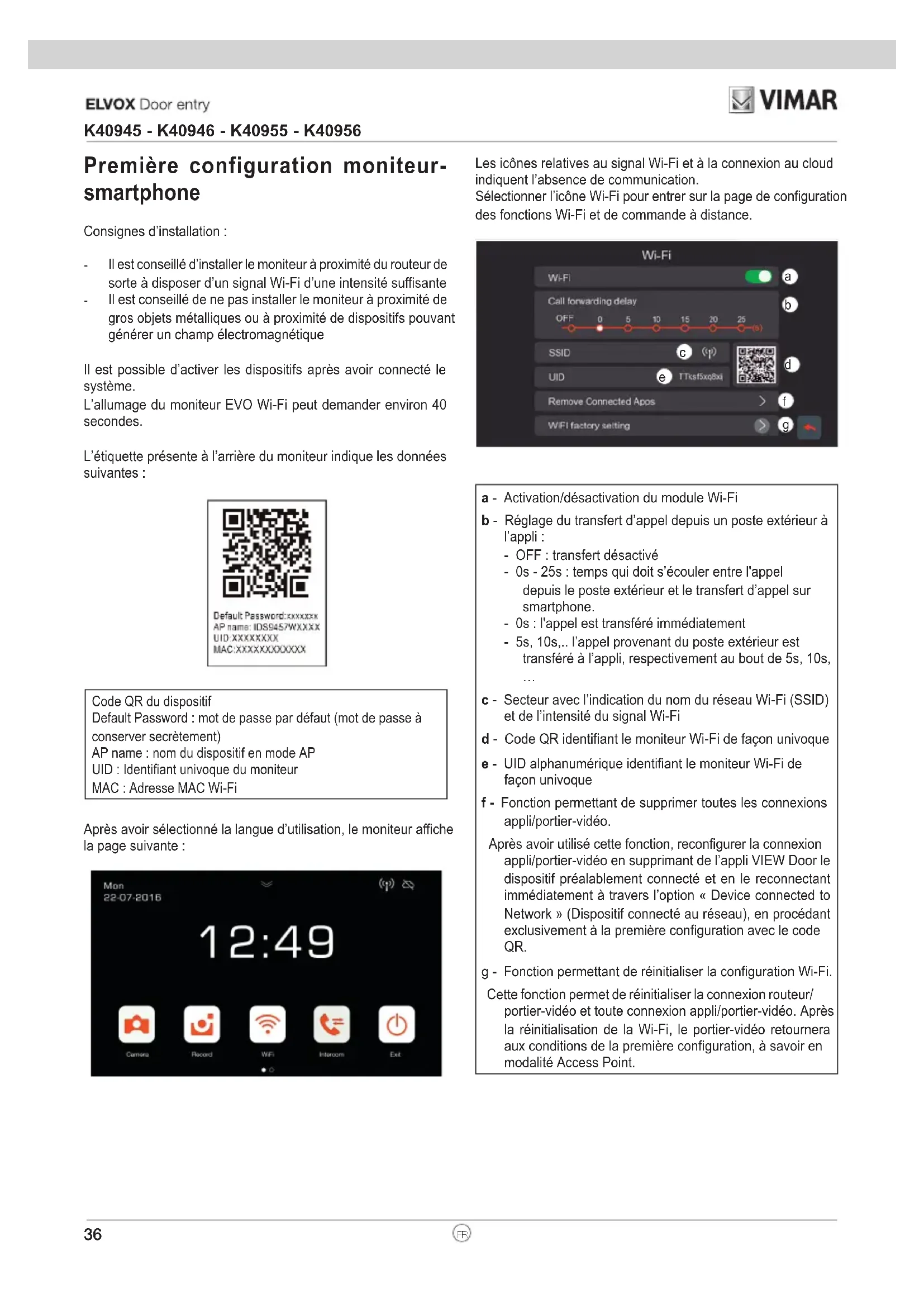 Pour la première conguration, s’assurer que le portier-vidéo est en modalité AP, à savoir que l'icône AP s’ache (c). Si le moniteur n’est pas en modalité AP, relancer la conguration du module Wi-Fi (g).