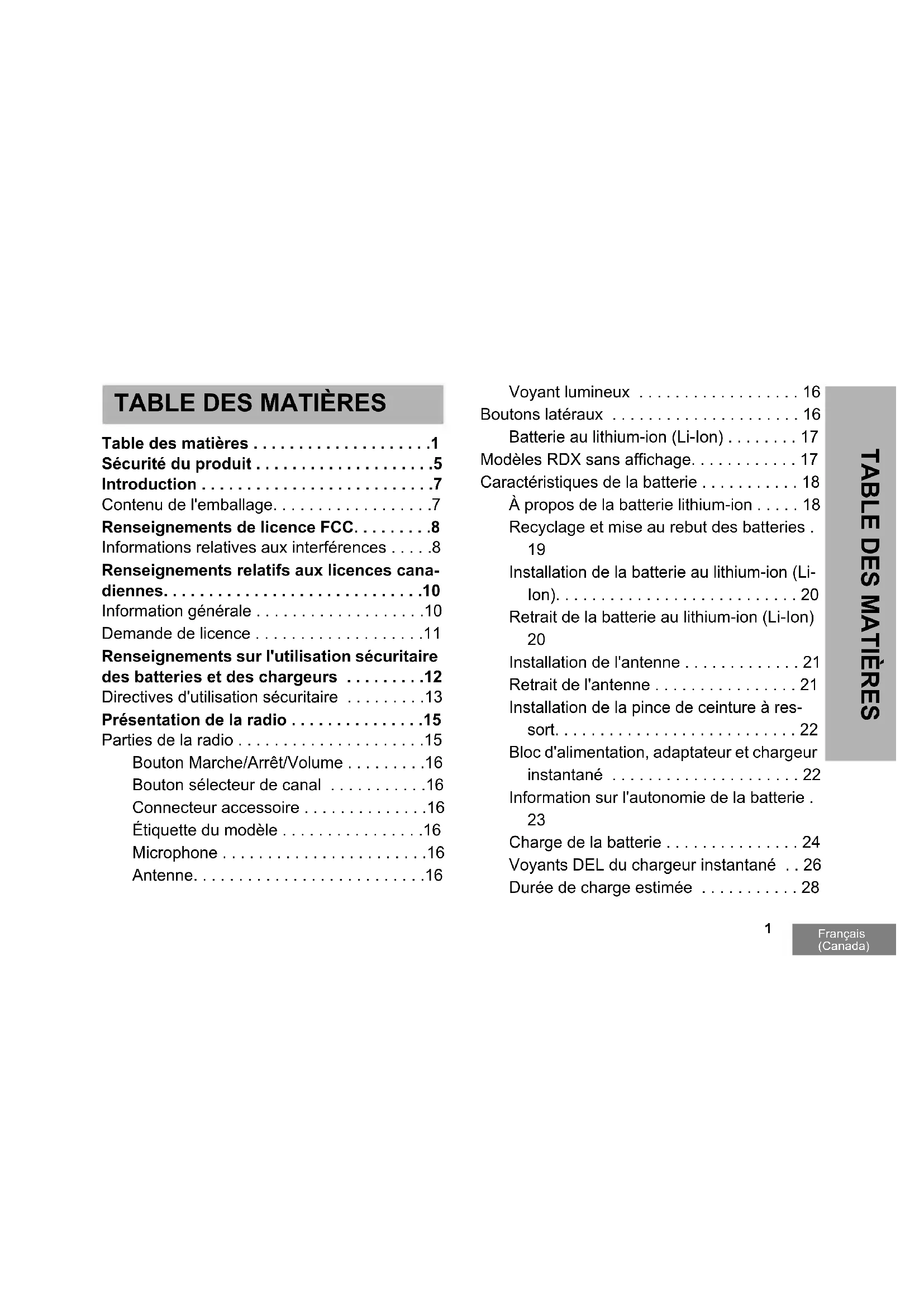 Charge de la batterie . . . . . . . . . . . . . . . 24 Voyants DEL du chargeur instantané . . 26 Durée de charge estimée . . . . . . . . . . . 28 MN002895A01_final.book Page 1 Thursday, January 5, 2017 10:51 AMFrançais (Canada)