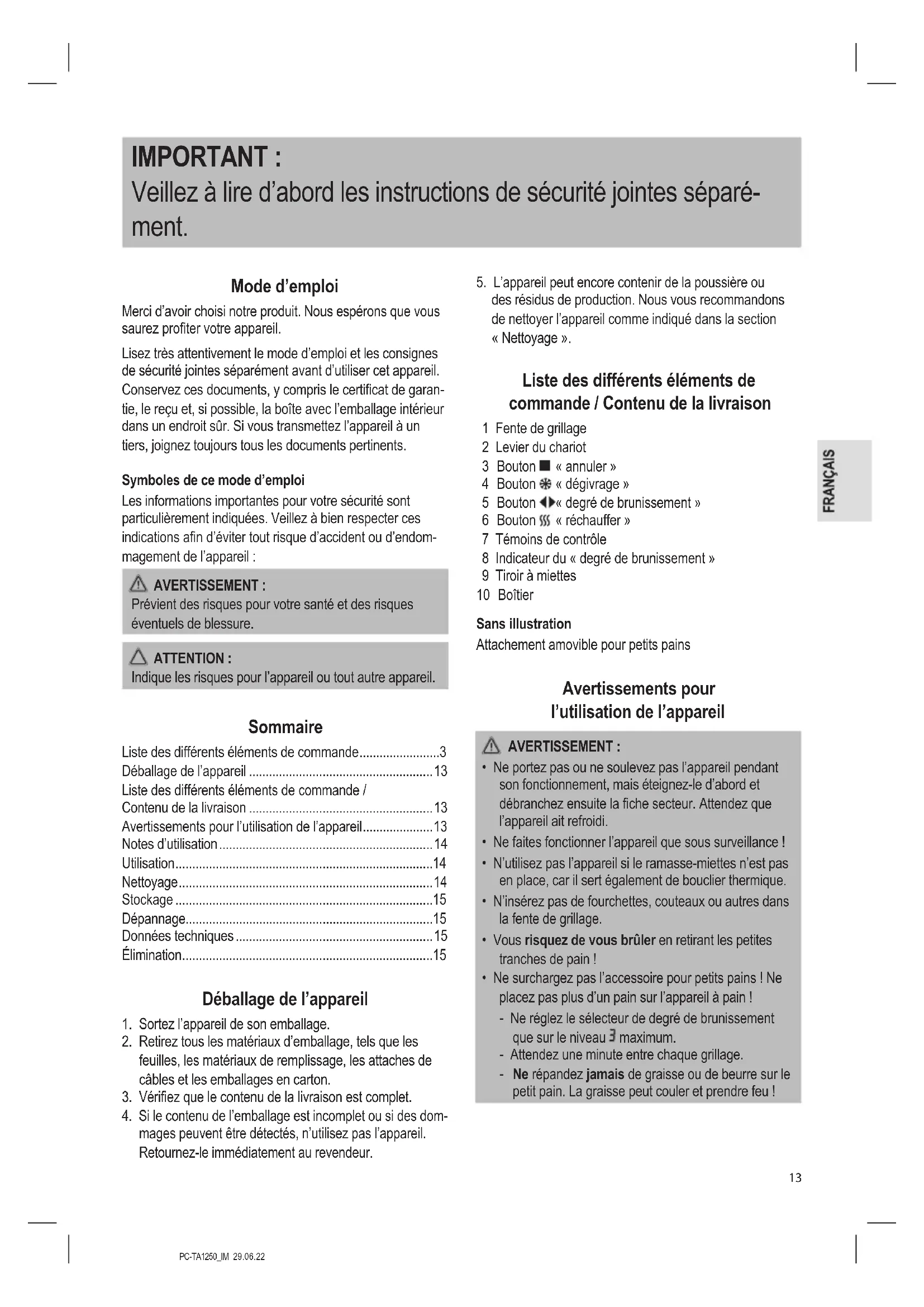 | Maintenance et réparation | Nettoyage facile grâce au tiroir ramasse-miettes amovible. Vérifiez régulièrement l'état des cordons et des prises. |