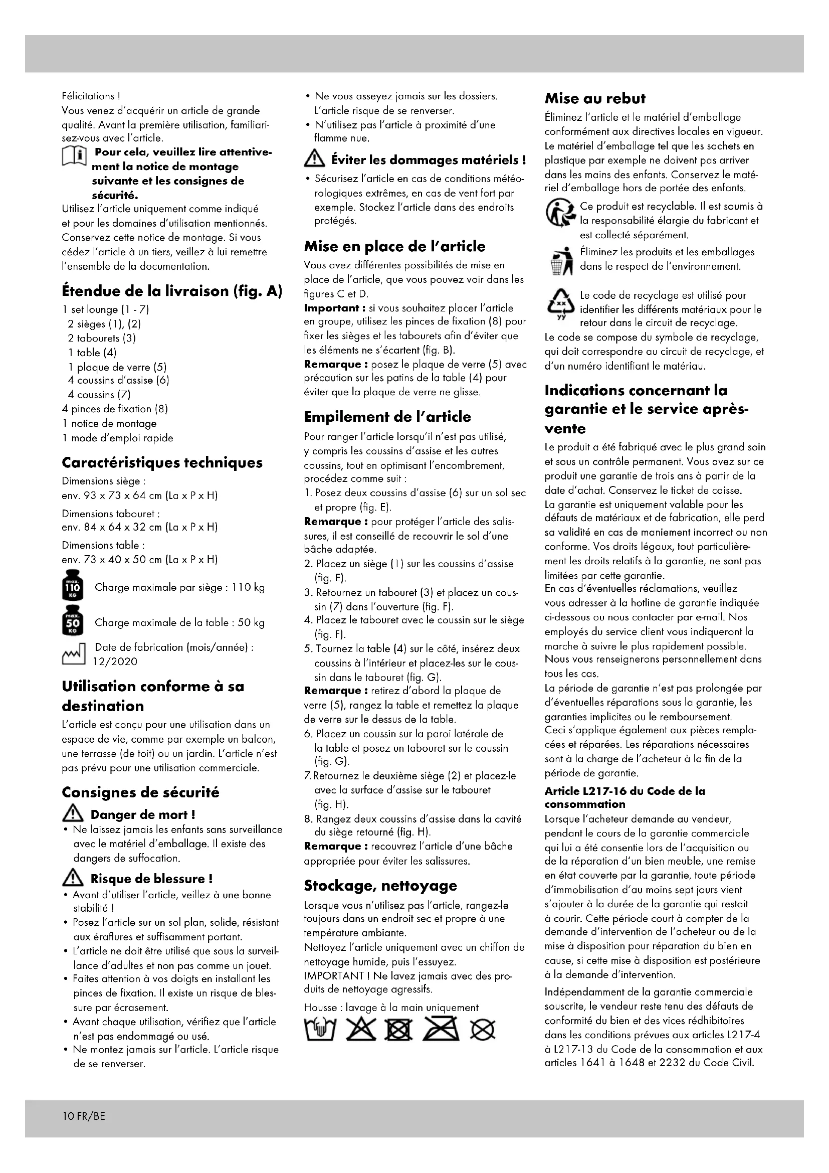 - Posez deux coussins d'assise (6) sur un sol sec et propre (fig. E).