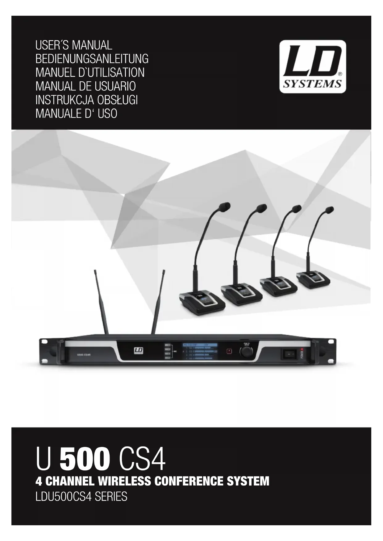 30. Si votre appareil est muni d‘un connecteur secteur verrouillable (Volex), il faut d‘abord déverrouiller le mécanisme avant d‘enlever le cordon secteur. Attention, lorsque vous retirez le câble secteur, à ne pas faire bouger l‘appareil, ce qui pourrait se traduire par un risque de chute, de blesser quelqu‘un, ou tout autre dommage. Manipulez toujours le cordon secteur avec soin. 31. Débranchez la fiche secteur ou l‘adaptateur de la prise murale en cas d‘orage, ou si vous n‘utilisez pas l‘appareil pendant une longue période.32 ITALIANO POLSKI ESPAÑOL FRANCAIS DEUTSCHENGLISH ATTENTION : Ne démontez jamais le couvercle de l‘appareil, vous risquez de recevoir un choc électrique. L‘appareil ne renferme aucune pièce ni composant réparable ou remplaçable par l‘utilisateur. Ne confiez l‘entretien et la réparation qu‘à un personnel qualifié. Le pictogramme en forme de triangle équilatéral contenant un éclair terminé d‘une flèche avertit l‘utilisateur de la présence d‘une tension dangereuse à l‘intérieur de l‘appareil, tension susceptible de provoquer un choc électrique. Le pictogramme en forme de triangle équilatéral renfermant un point d‘exclamation signale à l‘utilisateur la présence d‘instructions importantes concernant l‘utilisation ou l‘entretien de l‘appareil. ATTENTION ! La surface du boîtier du projecteur peut chauffer jusqu’à atteindre une température de 70 °C en fonctionnement normal. Assurez-vous d’éviter tout contact accidentel avec le boîtier. Laissez toujours la lampe refroidir suffisamment avant le démontage, les travaux de maintenance, le chargement, etc. Attention ! Cet appareil est conçu pour une utilisation à une altitude maximale de 2000 m au-dessus du niveau de la mer. Attention ! Ce produit ne convient pas à une utilisation dans les climats tropicaux. ATTENTION ! NIVEAUX SONORES ÉLEVÉS SUR LES PRODUITS AUDIO Cet appareil a été conçu en vue d‘une utilisation professionnelle. L‘utilisation commerciale de cet appareil est soumise aux réglementations et directives en vigueur dans votre pays en matière de prévention d‘accident. En tant que fabricant, Adam Hall est tenu de vous avertir formellement des risques relatifs à la santé. Risques provoqués par une exposition prolongée à des niveaux sonores élevés : Lors de l‘utilisation de ce produit, il est possible d‘atteindre des niveaux de pression sonore (exprimés en dB SPL) élevés, susceptibles de provoquer des dommages auditifs irréparables chez les artistes, les techniciens et le public. Évitez toute exposition prolongée à des niveaux de pression sonore élevés (supérieurs à 90 dB SPL). INTRODUCTION LD Systems U500 CS 4 - Système de conférences sans fil 4 canaux Les postes U500