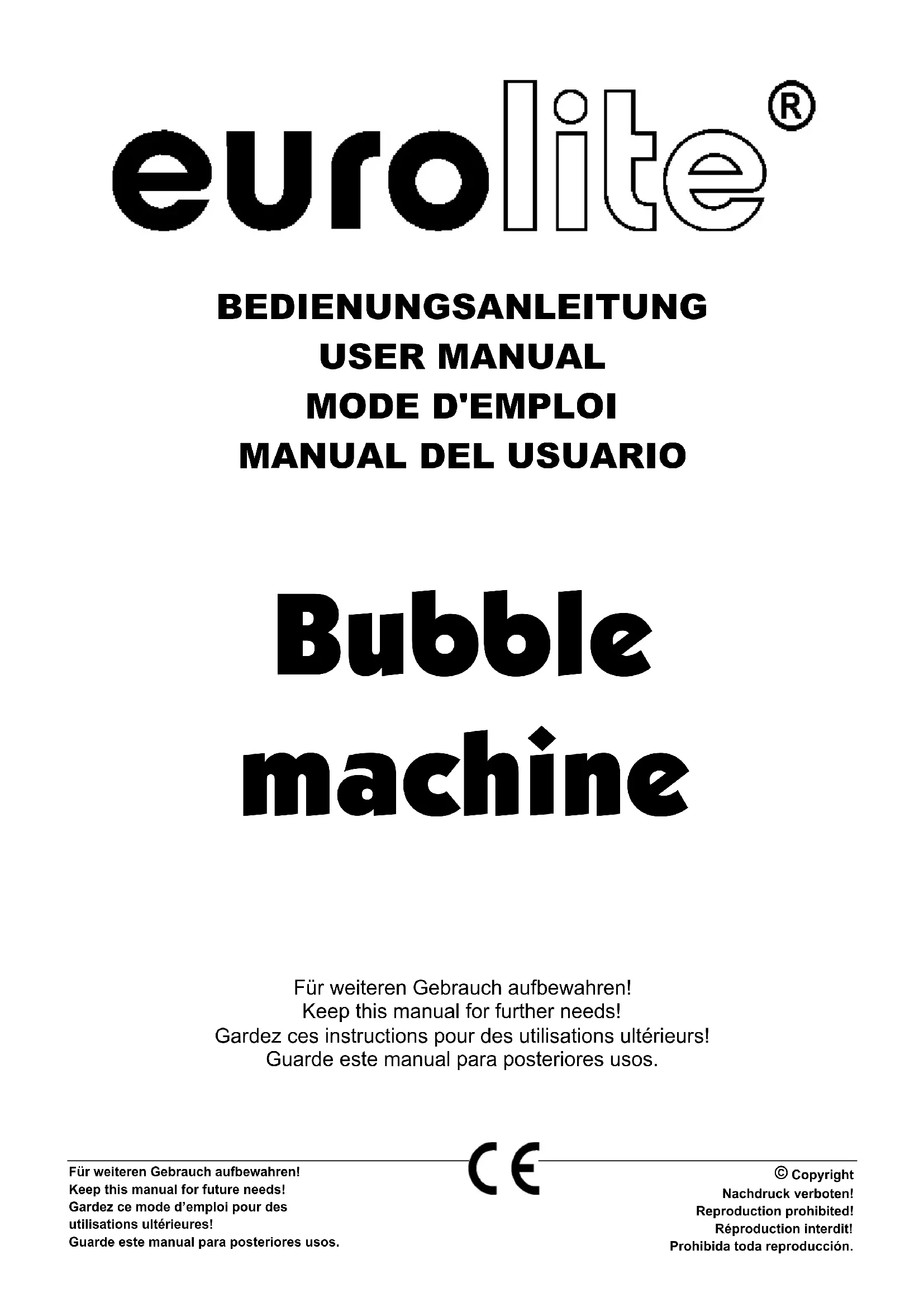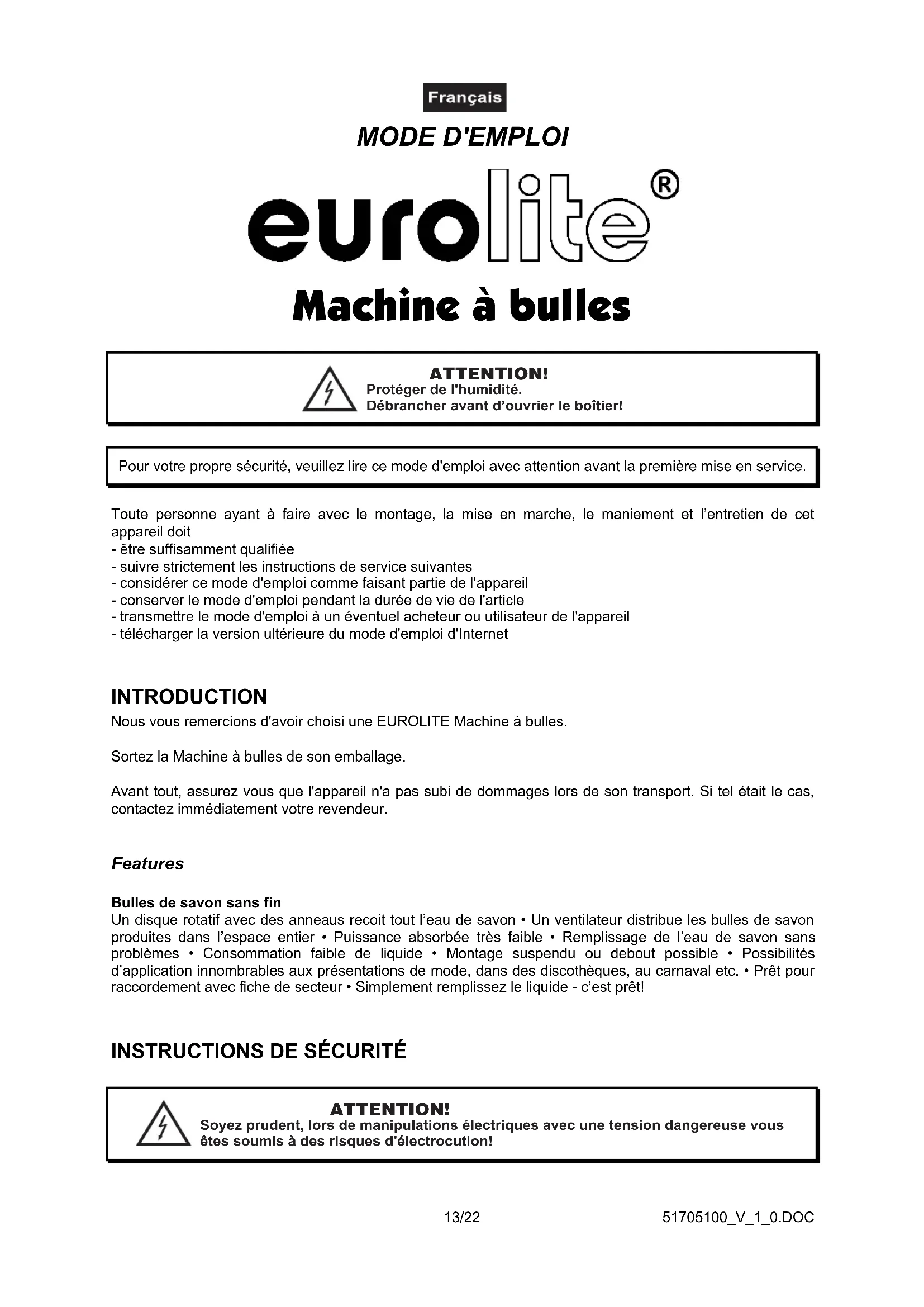 Disconnect from mains before starting maintenance operation! DANGER TO LIFE! We recommend a frequent cleaning of the device. Please use a soft lint-free and moistened cloth. Never use alcohol or solvents! There are no servicable parts inside the device except for the fuse. Maintenance and service operations are only to be carried out by authorized dealers. Replacing the fuse If the fine-wire fuse of the device fuses, only replace the fuse by a fuse of same type and rating.51705100_V_1_0.DOC 12/22 Before replacing the fuse, unplug mains lead. Procedure: Step 1: Unscrew the fuseholder on the rearpanel with a fitting screwdriver from the housing (anti- clockwise). Step 2: Remove the old fuse from the fuseholder. Step 3: Install the new fuse in the fuseholder. Step 4: Replace the fuseholder in the housing and fix it. Should you need any spare parts, please use genuine parts. If the power supply cable of this device will be damaged, it has to be replaced by authorized dealers only in order to avoid hazards. Should you have further questions, please contact your dealer. TECHNICAL SPECIFICATIONS Power supply: 230 V AC, 50 Hz ~ Power consumption: 35 W Tank volume: approx. 1 l Dimensions (LxWxH): 270 x 275 x 275 mm Weight: 3 kg Fuse: F 0,25 A, 250 V Please note: Every information is subject to change without prior notice. 03/01 ©51705100_V_1_0.DOC13/22 MODE D'EMPLOI Machine à bulles ATTENTION!Protéger de l'humidité. Débrancher avant d’ouvrier le boîtier! Pour votre propre sécurité, veuillez lire ce mode d'emploi avec attention avant la première mise en service. Toute personne ayant à faire avec le montage, la mise en marche, le maniement et l’entretien de cet appareil doit- être suffisamment qualifiée- suivre strictement les instructions de service suivantes- considérer ce mode d'emploi comme faisant partie de l'appareil- conserver le mode d'emploi pendant la durée de vie de l'article- transmettre le mode d'emploi à un éventuel acheteur ou utilisateur de l'appareil- télécharger la version ultérieure du mode d'emploi d'Internet INTRODUCTION Nous vous remercions d'avoir choisi une EUROLITE Machine à bulles.Sortez la Machine à bulles de son emballage. Avant tout, assurez vous que l'appareil n'a pas subi de dommages lors de son transport. Si tel était le cas, contactez immédiatement votre revendeur. Features Bulles de savon sans fin Un disque rotatif avec des anneaus recoit tout l’eau de savon • Un ventilateur distribue les bulles de savon produites dans l’espace entier • Puissance absorbée très faible • Remplissage de l’eau de savon sansproblèmes • Consommation faible de liquide • Montage suspendu ou debout possible • Possibilités d’application innombrables aux présentations de mode, dans des discothèques, au carnaval etc. • Prêt pour raccordement avec fiche de secteur • Simplement remplissez le liquide - c’est prêt!