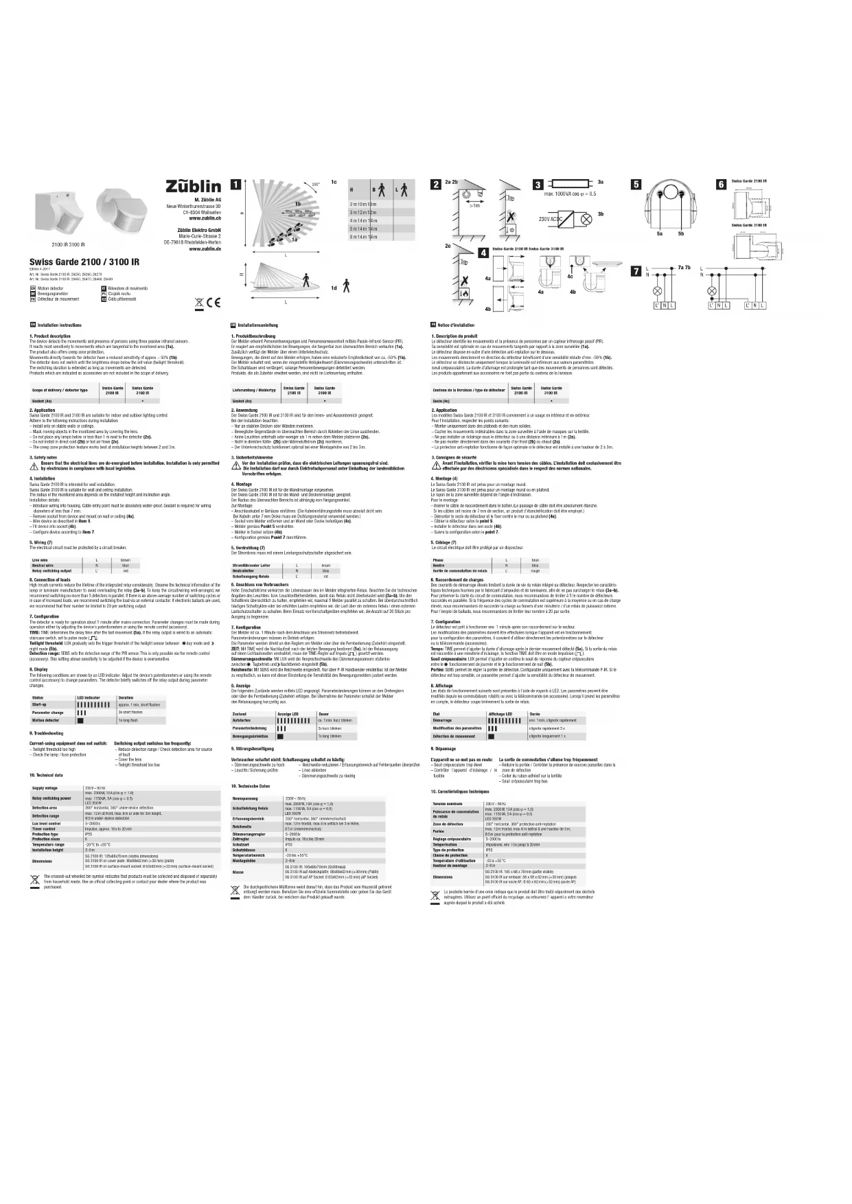 Avant l’installation, vérifier la mise hors tension des câbles. L’installation doit exclusivement être effectuée par des électriciens spécialisés dans le respect des normes nationales.4. Montage (4)Le Swiss Garde 2100IR est prévu pour un montage mural. Le Swiss Garde 3100IR est prévu pour un montage mural ou en plafond.Le rayon de la zone surveillée dépend de l’angle d’inclinaison. Pour le montage: – Insérer le câble de raccordement dans le boîtier. (Le passage de câble doit être absolument étanche. Si les câbles ont moins de 7 mm de section, un produit d’étanchéification doit être employé.)– Démonter le socle du détecteur et le fixer contre le mur ou au plafond (4a).– Câbler le détecteur selon le point5.– Installer le détecteur dans son socle (4b).– Suivre la configuration selon le point7.5. Câblage (7) Le circuit électrique doit être protégé par un disjoncteur.Phase L brunNeutre N bleu Sortie de commutation de relais L’ rouge