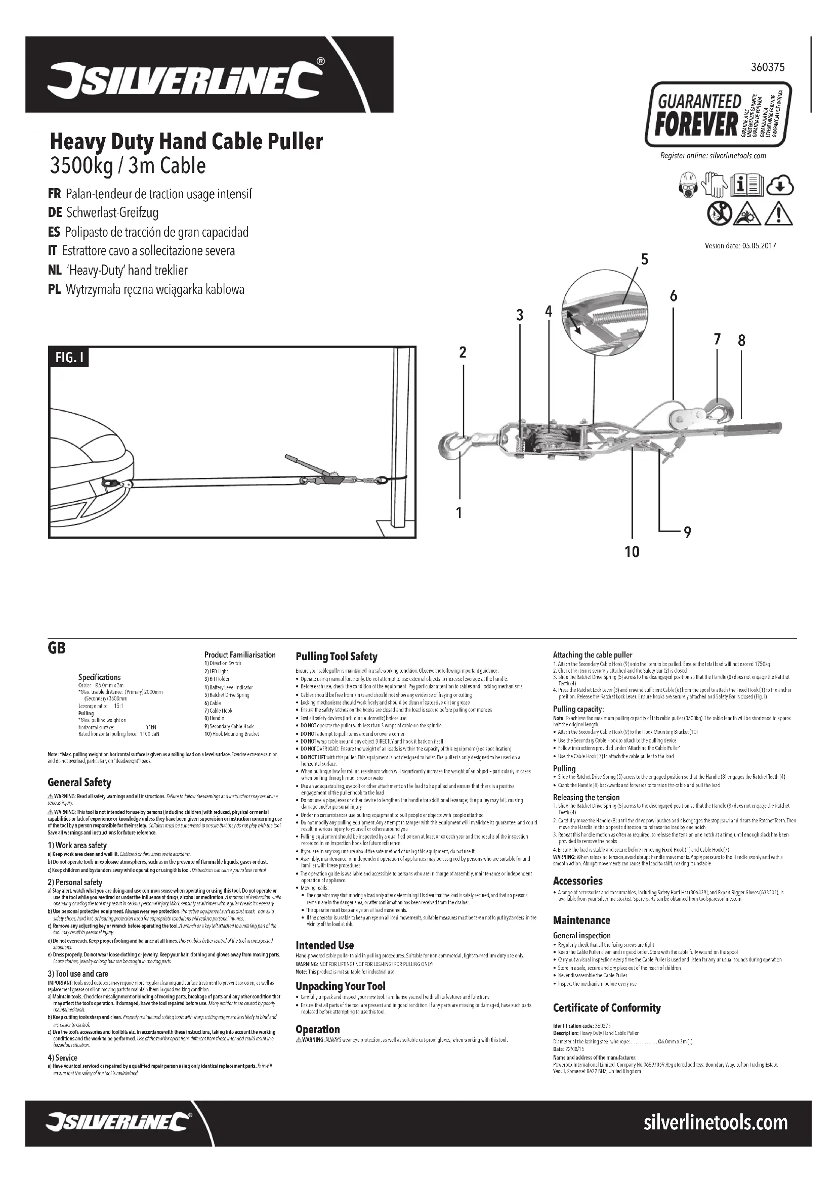- Inspectez le mécanisme avant chaque utilisation. Déclaration de conformité CE Code d’identication : 360375 Description : Palan-tendeur de traction usage intensif Diamètre du câble d’arrimage en acier : . . . . . . . . . . . . . . . Ø 6,0 mm x 3 m (L) Date: 22/08/15 Nom et adresse du fabricant ou de son représentant agréé : Powerbox International Limited, entreprise enregistrée sous le numéro 06897059. Siège social : Powerbox, Boundary Way, Lufton Trading Estate, Yeovil, Somerset BA22 8HZ, Royaume Uni.