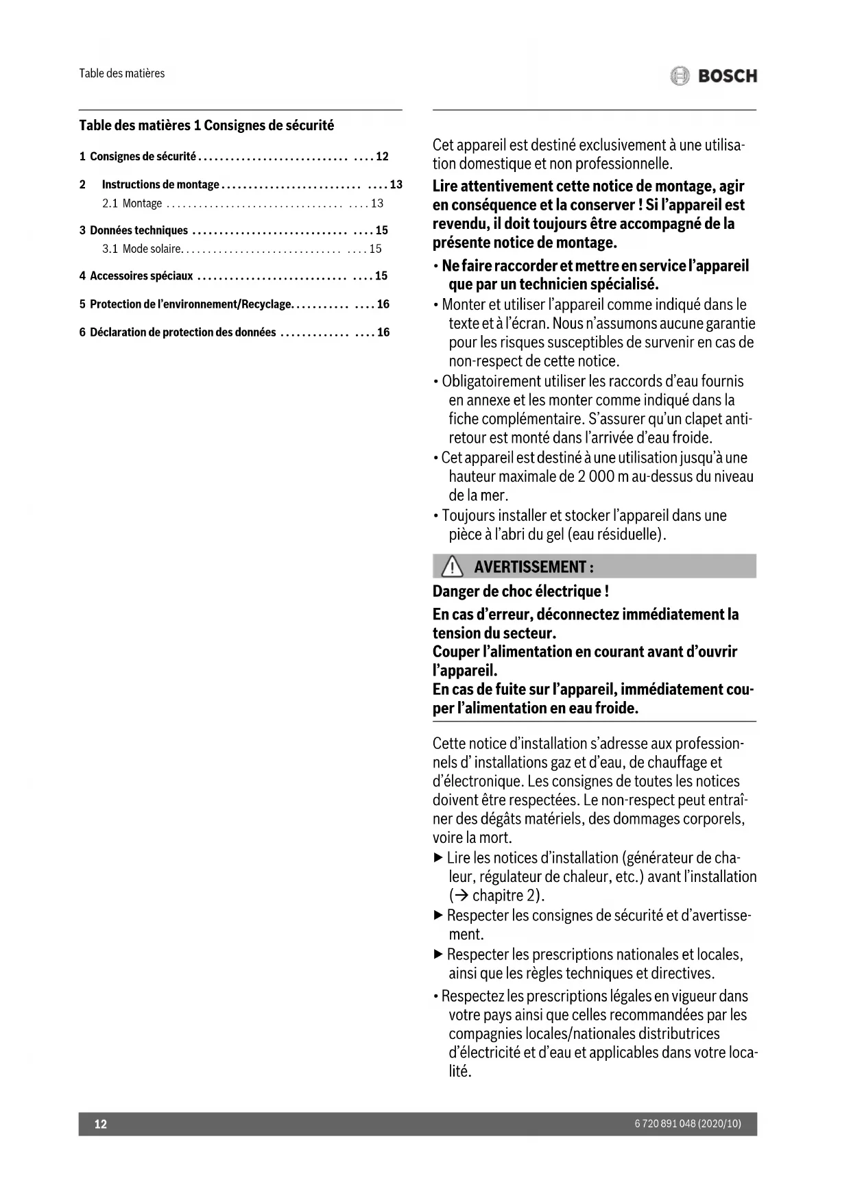Danger de choc électrique ! En cas d’erreur, déconnectez immédiatement la tension du secteur. Couper l’alimentation en courant avant d’ouvrir l’appareil. En cas de fuite sur l’appareil, immédiatement cou- per l’alimentation en eau froide. Cette notice d’installation s’adresse aux profession- nels d’ installations gaz et d’eau, de chauffage et d’électronique. Les consignes de toutes les notices doivent être respectées. Le non-respect peut entraî- ner des dégâts matériels, des dommages corporels, voire la mort. ▶ Lire les notices d’installation (générateur de cha- leur, régulateur de chaleur, etc.) avant l’installation ( chapitre 2). ▶ Respecter les consignes de sécurité et d’avertisse- ment. ▶ Respecter les prescriptions nationales et locales, ainsi que les règles techniques et directives.