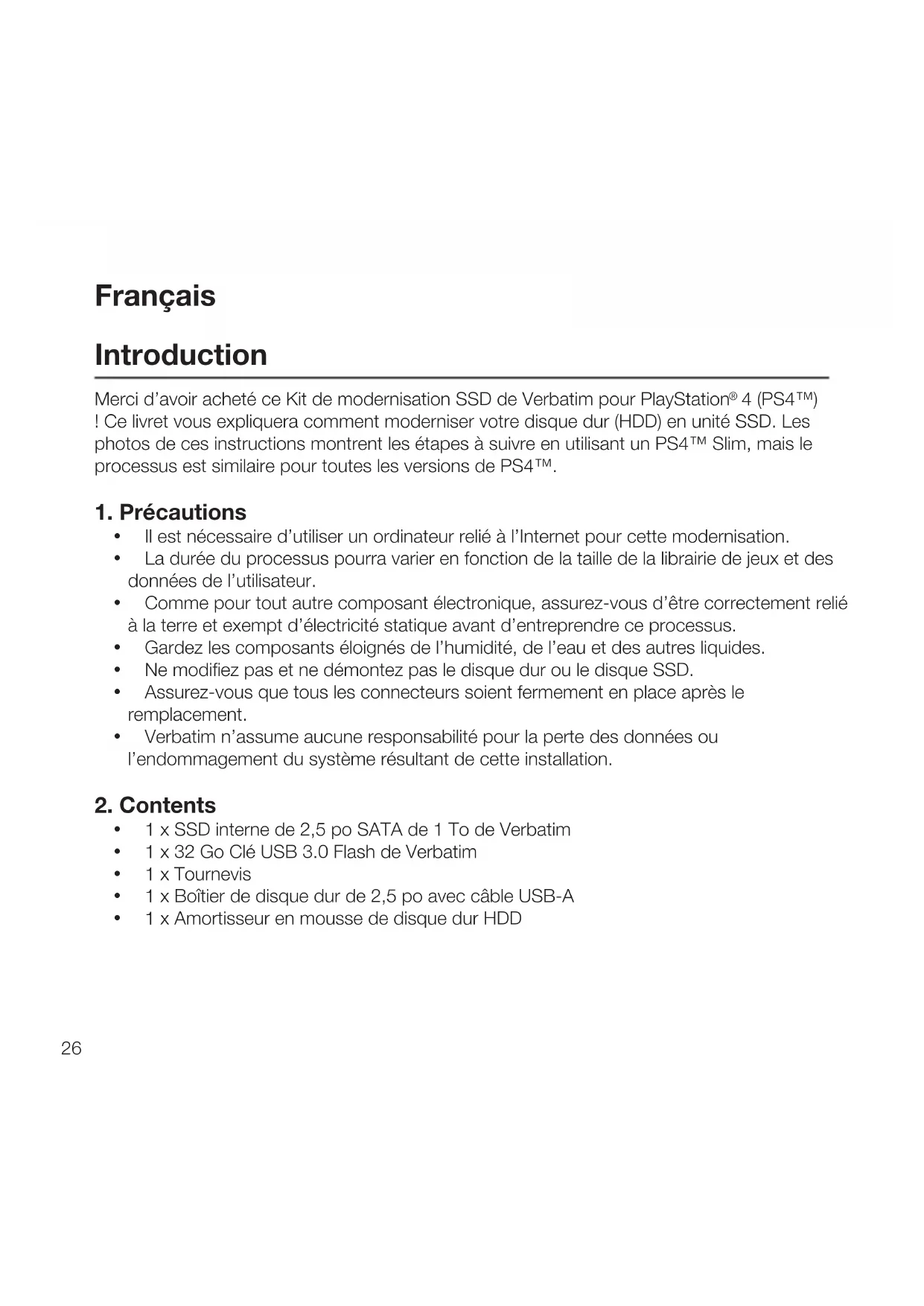 4 (PS4™) ! Ce livret vous expliquera comment moderniser votre disque dur (HDD) en unité SSD. Les photos de ces instructions montrent les étapes à suivre en utilisant un PS4™ Slim, mais le processus est similaire pour toutes les versions de PS4™.