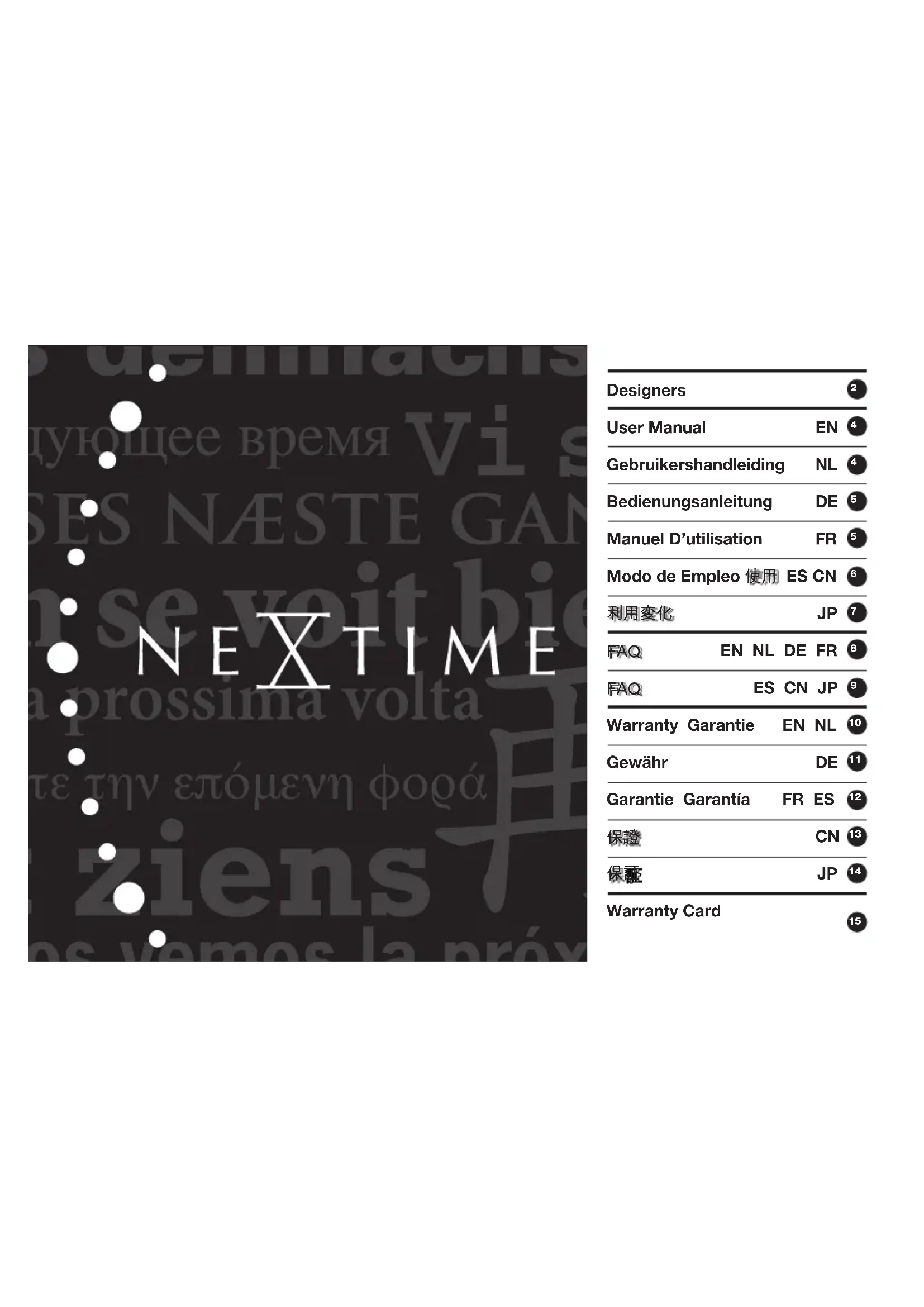 Pour garder votre horloge NeXtime en parfait état de marche pendant longtemps, respectez scrupuleusement les instructions de la notice d'utilisation. La satisfaction de nos clients est essentielle pour nous, c'est pourquoi nous sommes si exigeants sur la qualité de nos produits. Pour toute question ou remarque concernant votre horloge, prenez contact avec le magasin où vous l'avez acheté.