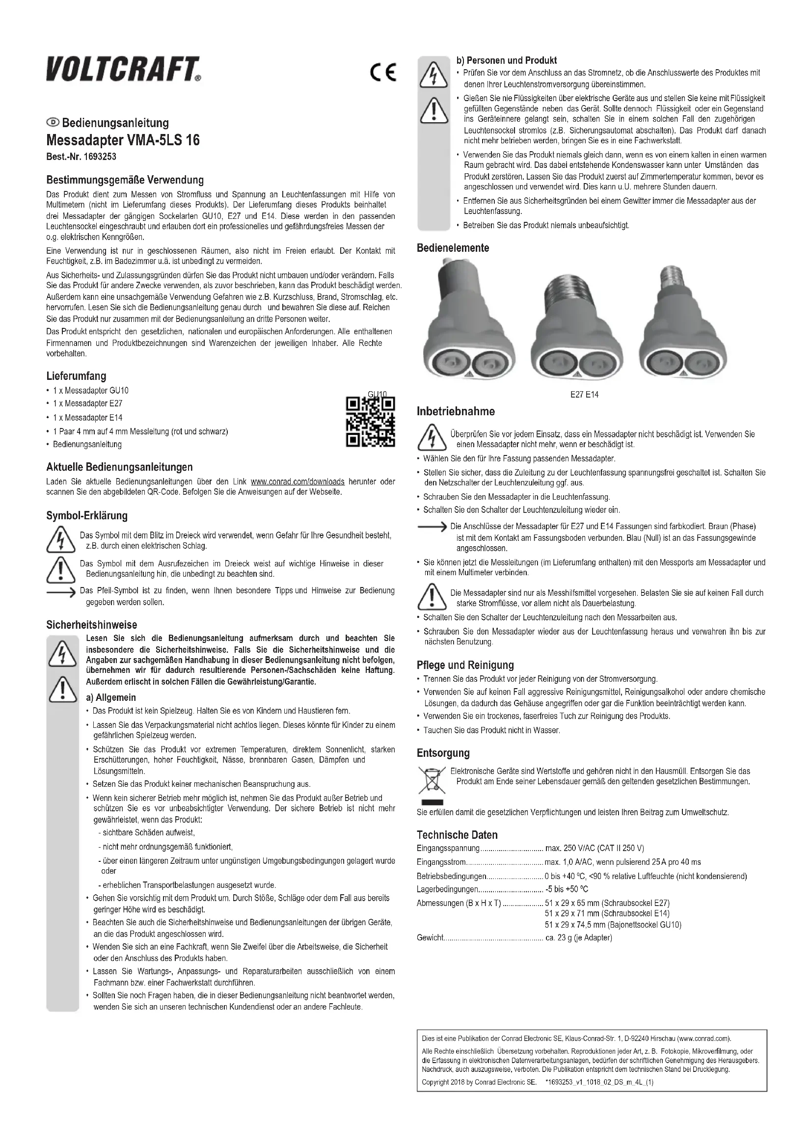 - Le produit ne doit en aucun cas être plongé dans l'eau. Élimination des déchets Les appareils électroniques sont des matériaux recyclables et ne doivent pas être éliminés avec les ordures ménagères. À la n de sa durée de vie, mettez l’appareil au rebut conformément aux dispositions légales en vigueur. Vous respecterez ainsi les ordonnances légales et contribuerez à la protection de l’environnement. Données techniques Tension d'entrée ................................... max. 250 V/CA (CAT II 250 V) Courant d’entrée ................................... max. 1,0 A/CA, si pulsé 25 A par 40 ms Conditions de service ........................... 0 à +40 ºC, ≤ 90 % humidité relative (sans condensation) Conditions de stockage ........................ -5 à 50 ºC Dimensions (l x h x P) ........................... 51 x 29 x 65 mm (culot à visser E27) 51 x 29 x 71 mm (culot à visser E14) 51 x 29 x 74,5 mm (culot à baïonnette GU10) Poids ..................................................... env. 23 g (par adaptateur) Mode d'emploi Adaptateur de mesure VMA-5LS 16 N° de commande 1693253 Utilisation prévue Le produit permet de mesurer le courant et la tension sur les douilles de lampe à l'aide de multimètres (non compris dans la livraison de ce produit). Le contenu de la livraison de ce produit comprend trois adaptateurs de mesure aux culots de types courants GU10, E27 et E14. Ces derniers se vissent dans les socles de lampe correspondants et permettent une mesure professionnelle et sans danger des grandeurs électriques mentionnées ci-dessus. L'utilisation est uniquement autorisée en intérieur, dans des locaux fermés ; l'utilisation en plein air est interdite. Tout contact avec l'humidité (par ex. dans une salle de bain) est à éviter absolument. Pour des raisons de sécurité et d'homologation, toute transformation et/ou modication du produit est interdite. Si vous utilisez le produit à d’autres ns que celles décrites précédemment, vous risquez de l’endommager. Par ailleurs, une utilisation incorrecte peut être source de dangers tels que court-circuit, incendie, électrocution. Lisez attentivement le mode d'emploi et conservez-le. Ne donnez le produit à un tiers qu'accompagné de son mode d'emploi. Le produit est conforme aux exigences des directives européennes et nationales en vigueur. Tous les noms d’entreprises et appellations de produits contenus dans ce mode d’emploi sont des marques déposées de leurs propriétaires respectifs. Tous droits réservés. Contenu