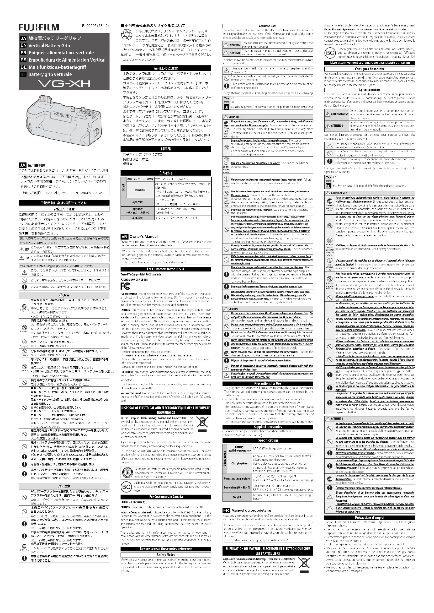 Manuel du propriétaire Nous vous remercions d’avoir acheté ce produit. Veuillez lire ces instruc-tions avant toute utilisation et rangez-les dans un endroit sûr.Lorsque vous utilisez ce produit, reportez-vous à la fois à ce guide et au chapitre sur les poignées-alimentations verticales du Manuel du propriétaire de l'appareil photo, disponible sur le site Internet ci-dessous. https://fujifilm-x.com/support/manual/cameras/ ÉLIMINATION DU MATÉRIEL ÉLECTRIQUE ET ÉLECTRONIQUE CHEZ LES PARTICULIERS Applicable à l’Union européenne, la Norvège, l’Islande et le Liechtenstein: Ce symbole sur le produit, ou dans le manuel et sur la garantie, et/ou sur son emballage, indique que l’appareil ne doit pas être traité comme un déchet ménager. Il doit être acheminé vers un point de collecte qui recycle le matériel électrique et électronique.Si votre matériel contient des piles ou des accumulateurs faciles à retirer, merci de les éliminer séparément conformément aux réglementations locales. Le recyclage des matériaux contribuera à préserver les ressources naturelles. Pour obtenir plus d’informations sur le recyclage de ce produit, veuillez prendre contact avec votre mairie, la déchetterie la plus proche de votre domicile ou le magasin où vous l’avez acheté.Code réglementaire de la Californie (California Code of Regulations), titre 20, division 2, chapitre 4, article 4, règlement sur l’efficacité énergétique (Appliance Efficiency Regulations), sections 1601 à 1609 Lisez attentivement ces remarques avant toute utilisation Consignes de sécurité Veillez à utiliser correctement votre appareil photo. Après avoir lu ces consignes de sécurité, rangez-les dans un endroit sûr. Des consignes de sécurité concernant la batterie et les accessoires sont disponibles dans le manuel de l'appareil photo, téléchargeable via le site Internet de Fujifilm.À propos des icônesLes icônes illustrées ci-dessous sont utilisées dans ce document pour indiquer le degré de gravité des blessures ou dommages qui peuvent se produire si vous n’observez pas les informations indiquées par l’icône et donc utilisez ce produit de manière incorrecte.AVERTISSEMENTCette icône indique que le fait de ne pas observer les informations mentionnées peut entraîner la mort ou des blessures graves.ATTENTIONCette icône indique que le fait de ne pas observer les informations mentionnées peut entraîner des blessures ou endommager le matériel.Les icônes illustrées ci-dessous sont utilisées pour indiquer la nature des instructions que vous devez observer.Les icônes triangulaires vous indiquent que ces informations nécessitent votre attention (« Important »).Les icônes circulaires barrées en diagonale vous informent que l'action indiquée est interdite (« Interdit »).Les cercles pleins qui contiennent un point d'exclamation vous informent que l'action doit être réalisée (« Requis »).Les symboles indiqués sur le produit (y compris les accessoires) ont la signification suivante: