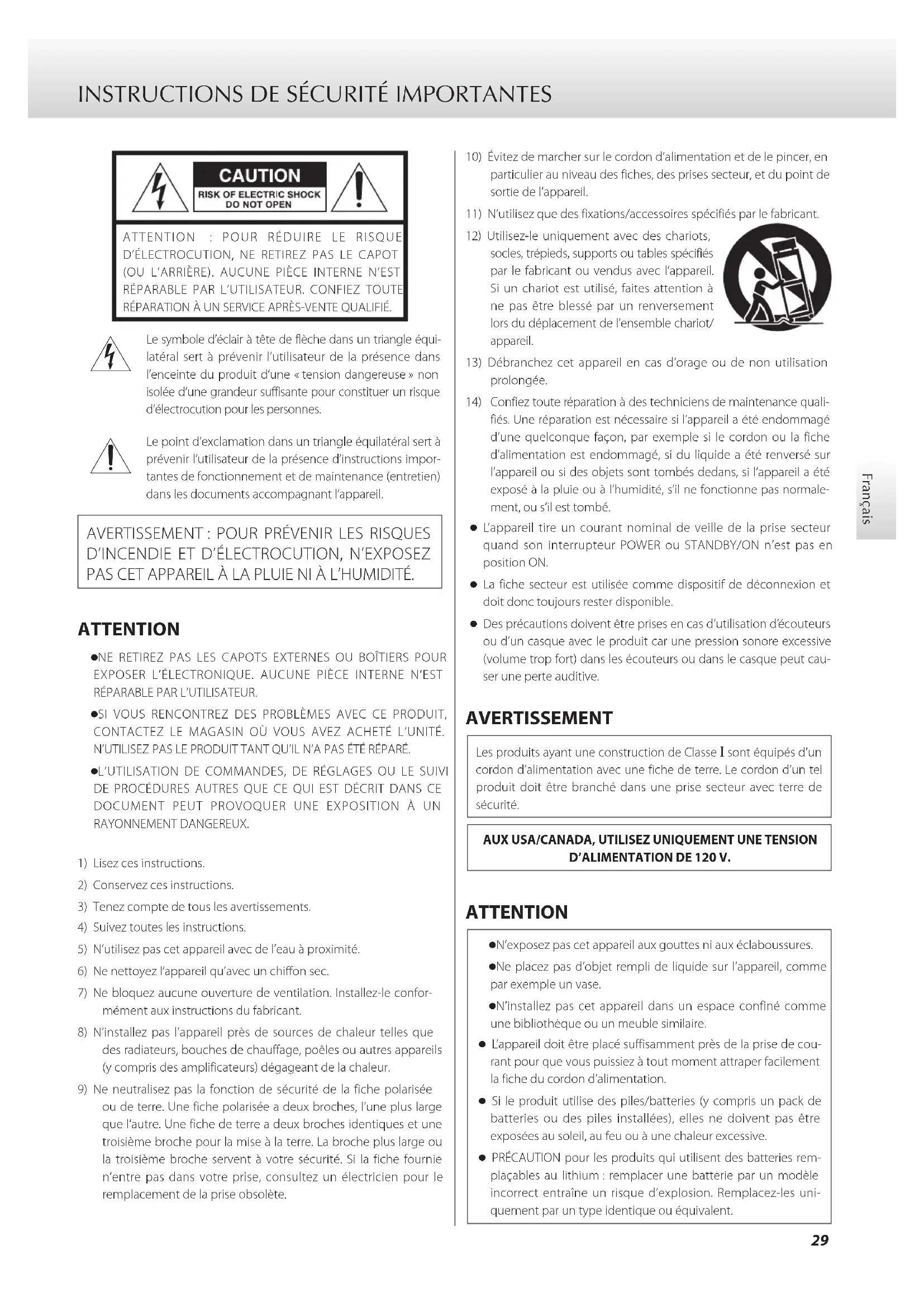 fiés. Une réparation est nécessaire si l’appareil a été endommagé d’une quelconque façon, par exemple si le cordon ou la fiche d’alimentation est endommagé, si du liquide a été renversé sur l’appareil ou si des objets sont tombés dedans, si l’appareil a été exposé à la pluie ou à l’humidité, s’il ne fonctionne pas normale-ment, ou s’il est tombé. o L’appareil tire un courant nominal de veille de la prise secteur quand son interrupteur POWER ou STANDBY/ON n’est pas en position ON. o La fiche secteur est utilisée comme dispositif de déconnexion et doit donc toujours rester disponible. o Des précautions doivent être prises en cas d’utilisation d’écouteurs ou d’un casque avec le produit car une pression sonore excessive (volume trop fort) dans les écouteurs ou dans le casque peut cau-ser une perte auditive. AVERTISSEMENT Les produits ayant une construction de Classe ! sont équipés d’un cordon d’alimentation avec une fiche de terre. Le cordon d’un tel produit doit être branché dans une prise secteur avec terre de sécurité.AUX USA/CANADA, UTILISEZ UNIQUEMENT UNE TENSION D’ALIMENTATION DE 120V. ATTENTION o N’exposez pas cet appareil aux gouttes ni aux éclaboussures. o Ne placez pas d’objet rempli de liquide sur l’appareil, comme par exemple un vase. o N’installez pas cet appareil dans un espace confiné comme une bibliothèque ou un meuble similaire. o L’appareil doit être placé suffisamment près de la prise de cou- rant pour que vous puissiez à tout moment attraper facilement la fiche du cordon d’alimentation. o Si le produit utilise des piles/batteries (y compris un pack de batteries ou des piles installées), elles ne doivent pas être exposées au soleil, au feu ou à une chaleur excessive. o PRÉCAUTION pour les produits qui utilisent des batteries rem- plaçables au lithium: remplacer une batterie par un modèle incorrect entraîne un risque d’explosion. Remplacez-les uni-quement par un type identique ou équivalent.30 INSTRUCTIONS DE SÉCURITÉ IMPORTANTES (suite) Modèle pour le Canada Déclaration de conformité d’Innovation, Sciences et Développement économique Canada: CET APPAREIL NUMÉRIQUE DE LA CLASSE B EST CONFORME À LA