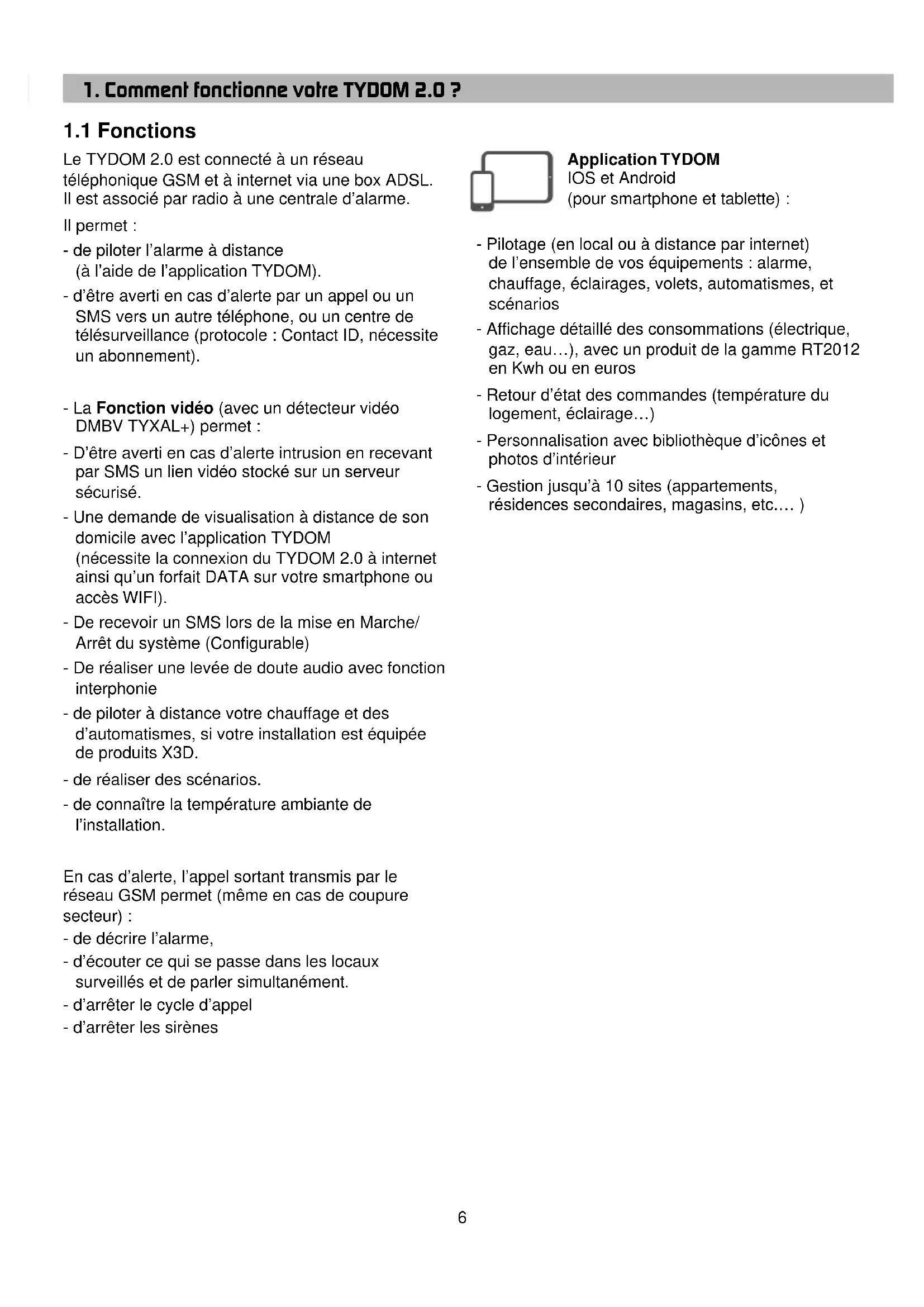 Le TYDOM 2.0 est connecté à un réseau téléphonique GSM et à internet via une box ADSL. Il est associé par radio à une centrale d’alarme. Il permet : - de piloter l’alarme à distance (à l’aide de l’application TYDOM). - d’être averti en cas d’alerte par un appel ou un SMS vers un autre téléphone, ou un centre de télésurveillance (protocole : Contact ID, nécessite un abonnement). - La Fonction vidéo (avec un détecteur vidéo DMBV TYXAL+) permet : - D’être averti en cas d’alerte intrusion en recevant par SMS un lien vidéo stocké sur un serveur sécurisé. - Une demande de visualisation à distance de son domicile avec l’application TYDOM (nécessite la connexion du TYDOM 2.0 à internet ainsi qu’un forfait DATA sur votre smartphone ou accès WIFI). - De recevoir un SMS lors de la mise en Marche/ Arrêt du système (Configurable) - De réaliser une levée de doute audio avec fonction interphonie - de piloter à distance votre chauffage et des d’automatismes, si votre installation est équipée de produits X3D. - de réaliser des scénarios. - de connaître la température ambiante de l’installation. En cas d’alerte, l’appel sortant transmis par le réseau GSM permet (même en cas de coupure secteur) : - de décrire l’alarme, - d’écouter ce qui se passe dans les locaux surveillés et de parler simultanément. - d’arrêter le cycle d’appel - d’arrêter les sirènes Application TYDOM IOS et Android (pour smartphone et tablette) : - Pilotage (en local ou à distance par internet) de l’ensemble de vos équipements : alarme, chauffage, éclairages, volets, automatismes, et scénarios - Affichage détaillé des consommations (électrique, gaz, eau…), avec un produit de la gamme RT2012 en Kwh ou en euros - Retour d’état des commandes (température du logement, éclairage…) - Personnalisation avec bibliothèque d’icônes et photos d’intérieur - Gestion jusqu’à 10 sites (appartements, résidences secondaires, magasins, etc.… )5 Le TYDOM 2.0 et les autres produits de la gamme TYXAL+, détecteurs intrusion, détecteurs techniques, sirènes, claviers ou télécommandes, sont associés à la centrale CS 8000 TYXAL+ (50 produits max.).