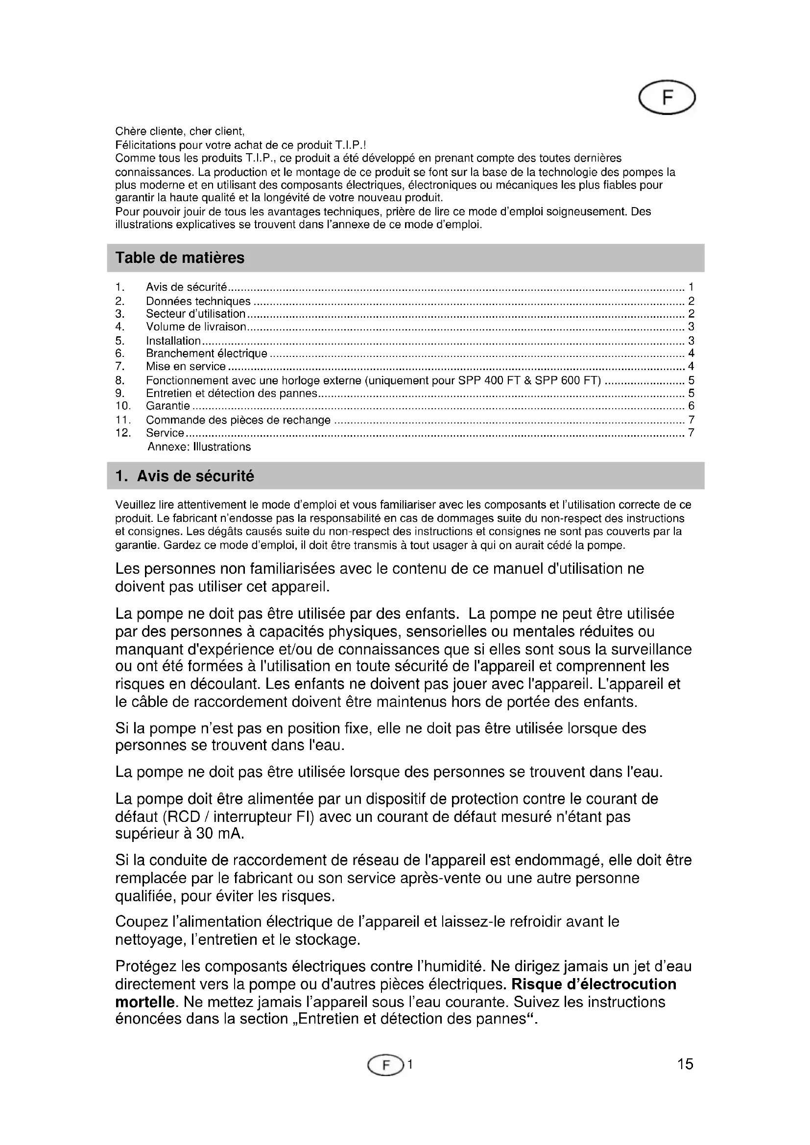 SPP 400 FT - Pompe à eau T.I.P. - Notice d'utilisation et mode d'emploi gratuit