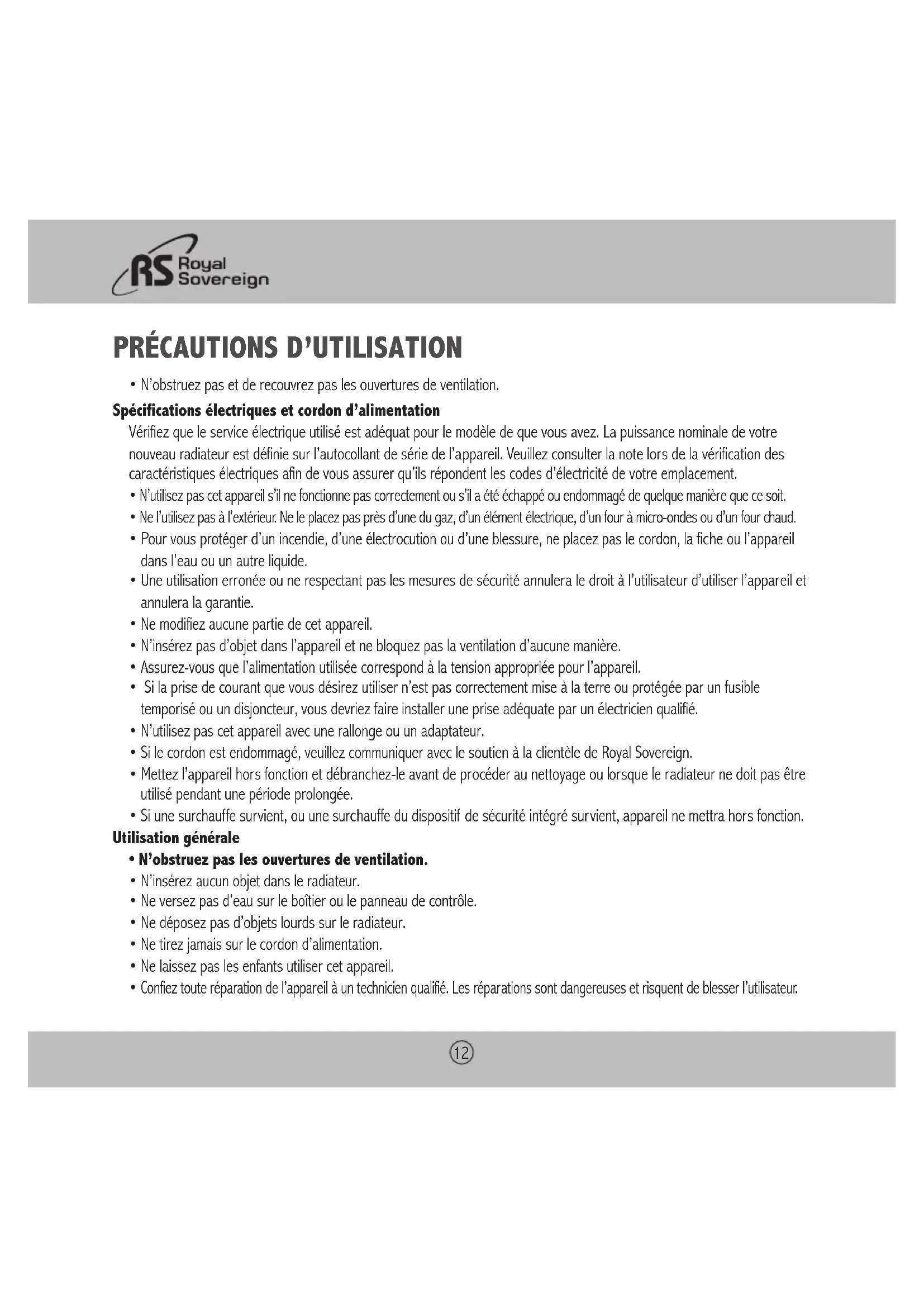 - Si le cordon est endommagé, veuillez communiquer avec le soutien à la clientèle de Royal Sovereign.