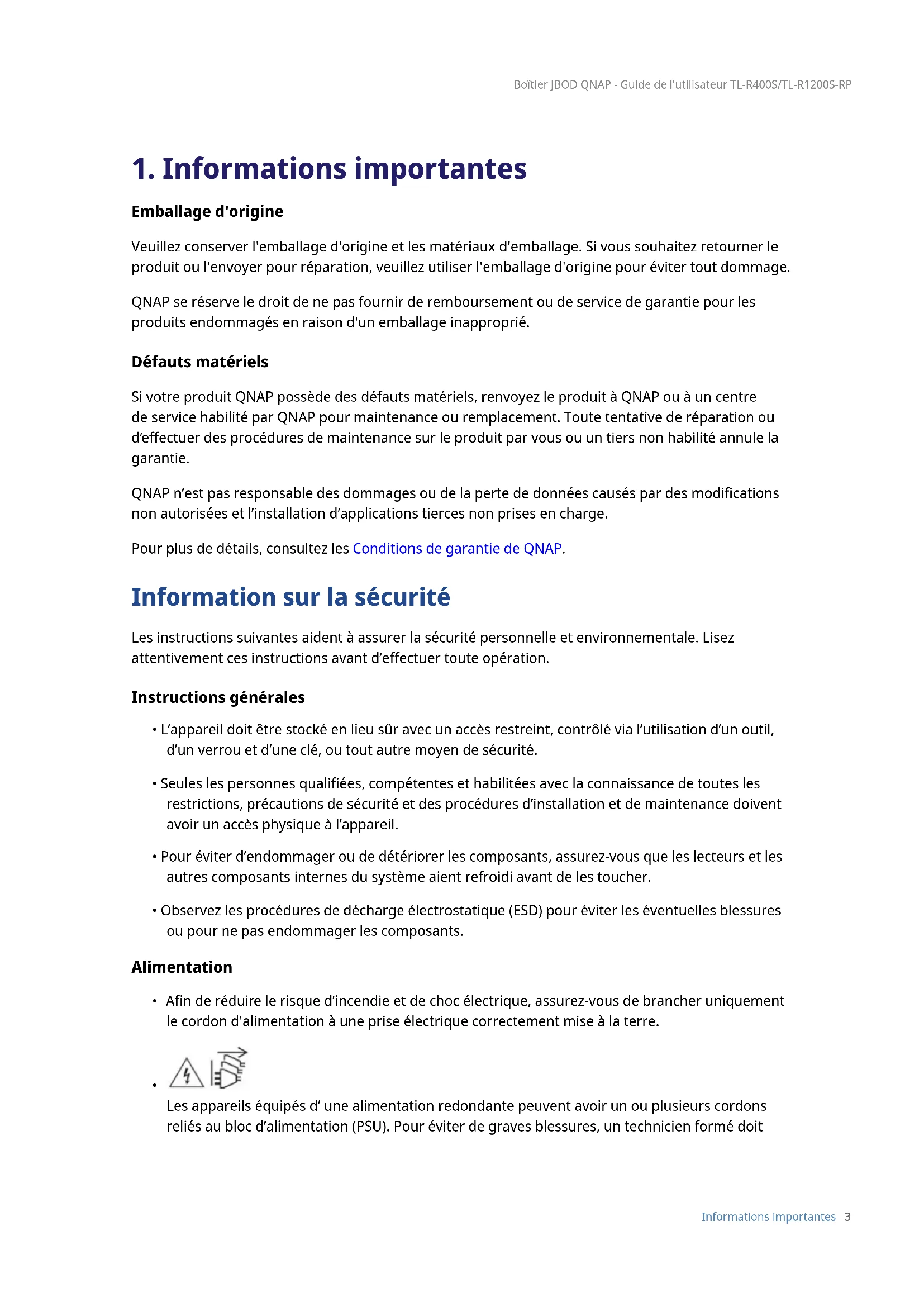 Emballage d'origine Veuillez conserver l'emballage d'origine et les matériaux d'emballage. Si vous souhaitez retourner le produit ou l'envoyer pour réparation, veuillez utiliser l'emballage d'origine pour éviter tout dommage. QNAP se réserve le droit de ne pas fournir de remboursement ou de service de garantie pour les produits endommagés en raison d'un emballage inapproprié. Défauts matériels Si votre produit QNAP possède des défauts matériels, renvoyez le produit à QNAP ou à un centre de service habilité par QNAP pour maintenance ou remplacement. Toute tentative de réparation ou d’eectuer des procédures de maintenance sur le produit par vous ou un tiers non habilité annule la garantie. QNAP n’est pas responsable des dommages ou de la perte de données causés par des modications non autorisées et l’installation d’applications tierces non prises en charge. Pour plus de détails, consultez les Conditions de garantie de QNAP. Information sur la sécurité Les instructions suivantes aident à assurer la sécurité personnelle et environnementale. Lisez attentivement ces instructions avant d’eectuer toute opération. Instructions générales