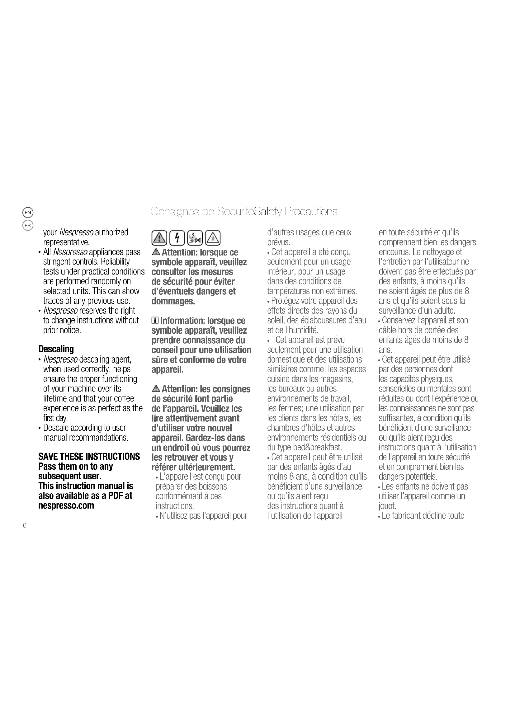 Pass them on to any subsequent user. This instruction manual is also available as a PDF at nespresso.com Attention: lorsque ce symbole apparaît, veuillez consulter les mesures de sécurité pour éviter d’éventuels dangers et dommages. Information: lorsque ce symbole apparaît, veuillez prendre connaissance du conseil pour une utilisation sûre et conforme de votre appareil. Attention: les consignes de sécurité font partie de l’appareil. Veuillez les lire attentivement avant d’utiliser votre nouvel appareil. Gardez-les dans un endroit où vous pourrez les retrouver et vous y référer ultérieurement.