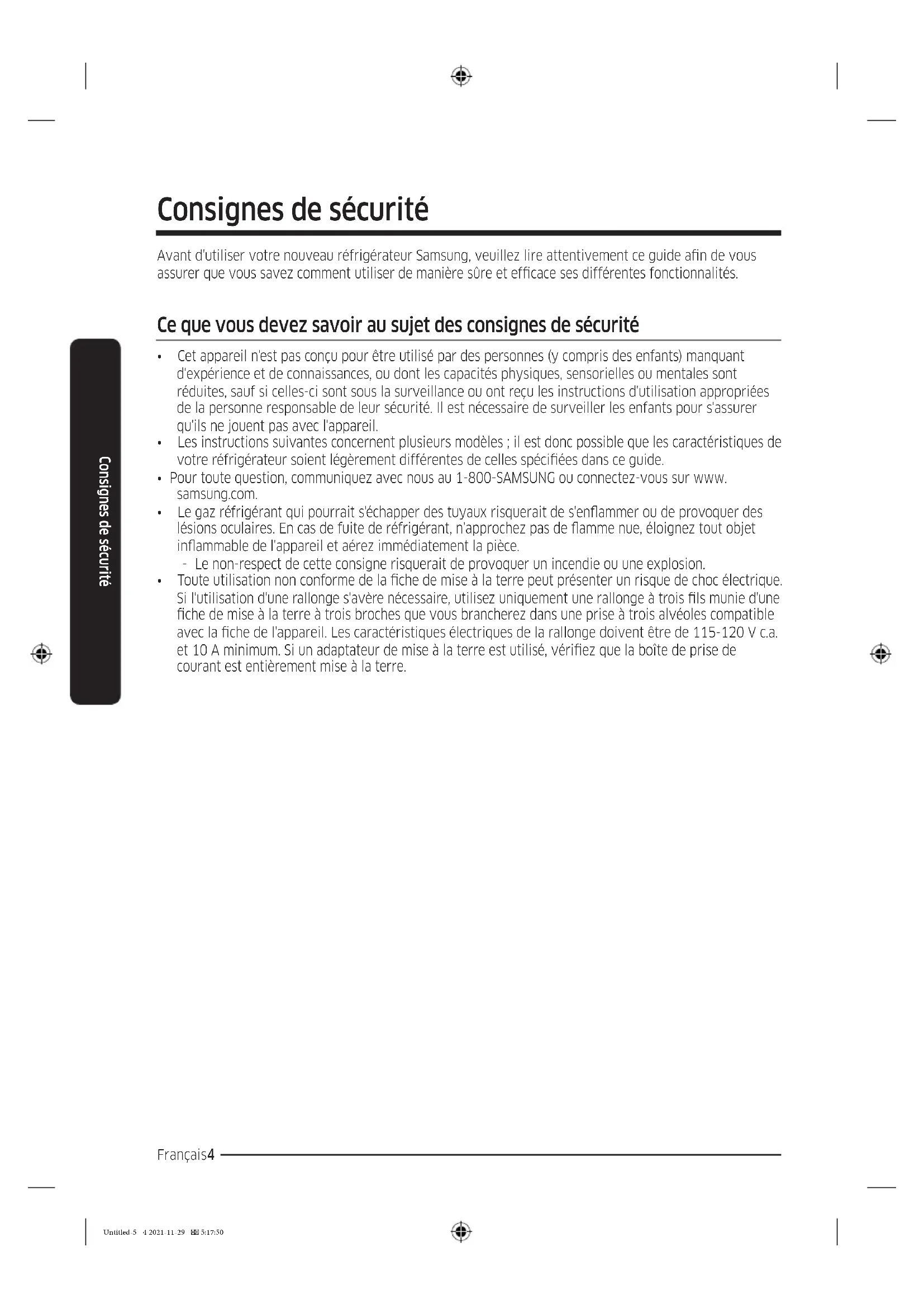 - Requires reader to be installed on your smartphone Contacte a SAMSUNG WORLD WIDE Si tiene preguntas o comentarios relacionados con los productos Samsung, póngase en contacto con el Servicio de Atención al Cliente de SAMSUNG. País Centro de contacto Sitio web U.S.A 1-800-SAMSUNG (726-7864) 1-844-SAM-PAYS (726-7297) www.samsung.com/us/support CANADA 1-800-SAMSUNG (726-7864) 1-844-SAM-PAYS (726-7297) www.samsung.com/ca/support (English) www.samsung.com/ca_fr/support (French) DA68-04402B-00 Untitled-4 84 2021-11-29 5:09:57Réfrigérateur Guide d'utilisation Appareil amovible Untitled-5 1 2021-11-29 5:17:50Français2 Sommaire Sommaire Consignes de sécurité 4 Ce que vous devez savoir au sujet des consignes de sécurité 4 Consignes de sécurité importantes et symboles : 5 Avertissement de la proposition 65 de l'État de Californie 5 Consignes de sécurité importantes 5 Symboles d'avertissement importants concernant le transport et le lieu d'installation de l'appareil 7 Avertissements importants concernant l'installation 8 Installation en toute sécurité 9 Avertissements importants concernant l'utilisation 10 Utilisation en toute sécurité 12 Nettoyage en toute sécurité 13 Avertissements importants concernant la mise au rebut 14 Installation 15 Présentation rapide du réfrigérateur 16 Installation étape par étape 19 Opérations 36 Panneau principal 36 SmartThings 43 Fonction SMART GRID (Réponse à la demande) (modèles applicables uniquement) 46 Fonctions spéciales 49 Maintenance 56 Utilisation et entretien 56 Nettoyage 64 Remplacement 65 Dépannage 69 Généralités 69 Votre réfrigérateur émet-il un bruit anormal ? 73 SmartThings 76 Smart Grid (modèles applicables uniquement) 77 Informations relatives à la garantie (CANADA) 78 Si votre réfrigérateur doit être réparé 78 Garantie limitée à l'acheteur initial 78 Obligation du propriétaire initial 78 Exclusions de la garantie 79 Untitled-5 2 2021-11-29 5:17:50Français 3 Sommaire Avis d'application de la réglementation 80 Avis de la FCC 80 Avis d'IC 81 Open Source Announcement 82 Untitled-5 3 2021-11-29 5:17:50Français4 Consignes de sécurité Avant d'utiliser votre nouveau réfrigérateur Samsung, veuillez lire attentivement ce guide an de vous assurer que vous savez comment utiliser de manière sûre et efcace ses différentes fonctionnalités. Ce que vous devez savoir au sujet des consignes de sécurité