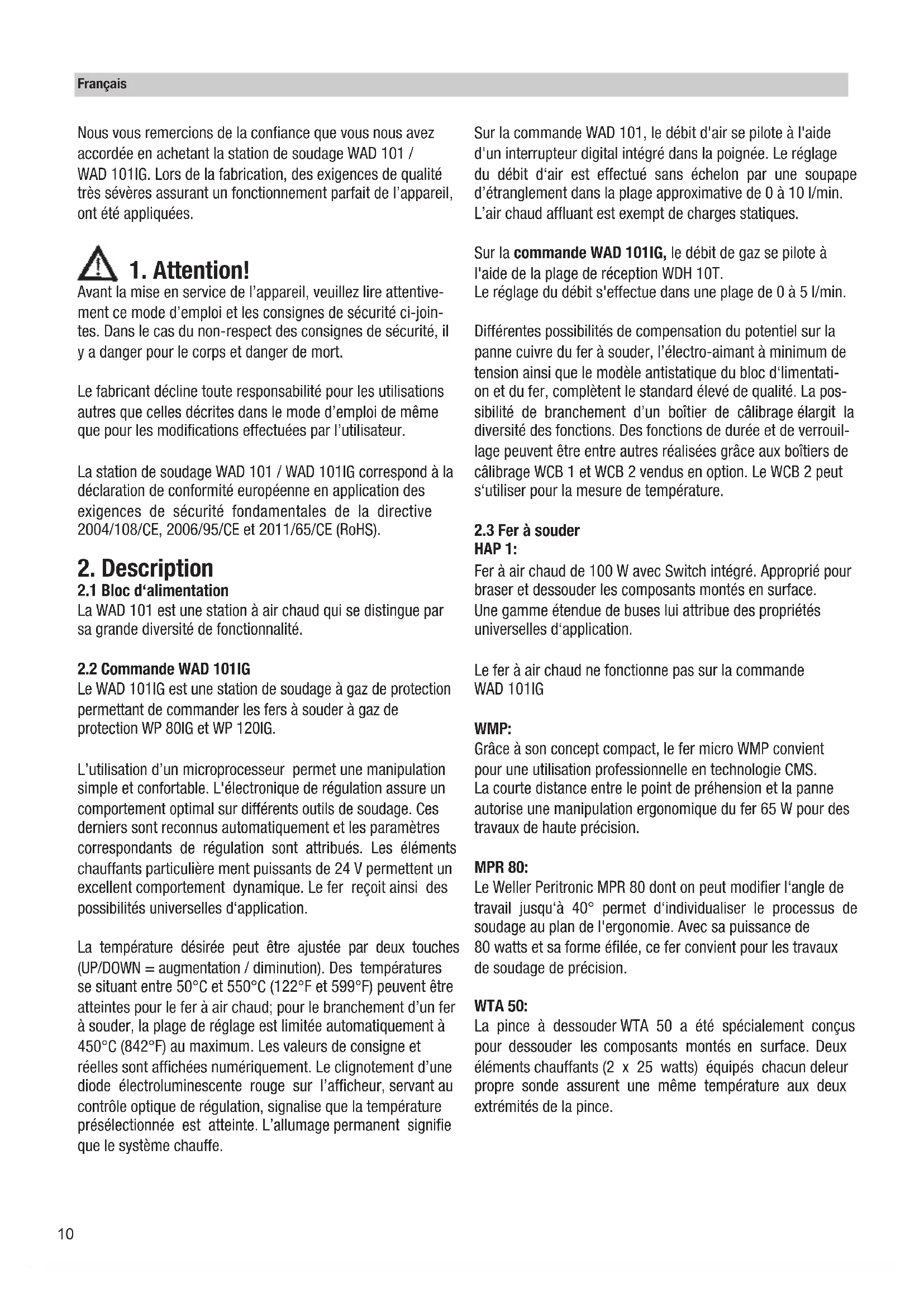 Avant la mise en service de l’appareil, veuillez lire attentive- ment ce mode d’emploi et les consignes de sécurité ci-join- tes. Dans le cas du non-respect des consignes de sécurité, il y a danger pour le corps et danger de mort. Le fabricant décline toute responsabilité pour les utilisations autres que celles décrites dans le mode d’emploi de même que pour les modifications effectuées par l’utilisateur. La station de soudage WAD 101 / WAD 101IG correspond à la déclaration de conformité européenne en application des exigences de sécurité fondamentales de la directive 2004/108/CE, 2006/95/CE et 2011/65/CE (RoHS).