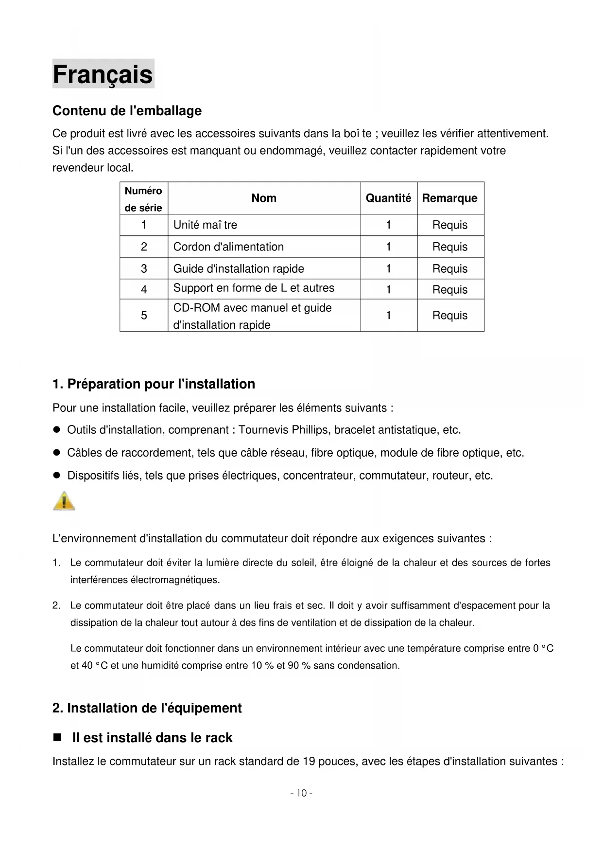 Pour une installation facile, veuillez préparer les éléments suivants : Outils d'installation, comprenant : Tournevis Phillips, bracelet antistatique, etc. Câbles de raccordement, tels que câble réseau, fibre optique, module de fibre optique, etc. Dispositifs liés, tels que prises électriques, concentrateur, commutateur, routeur, etc. L'environnement d'installation du commutateur doit répondre aux exigences suivantes :
